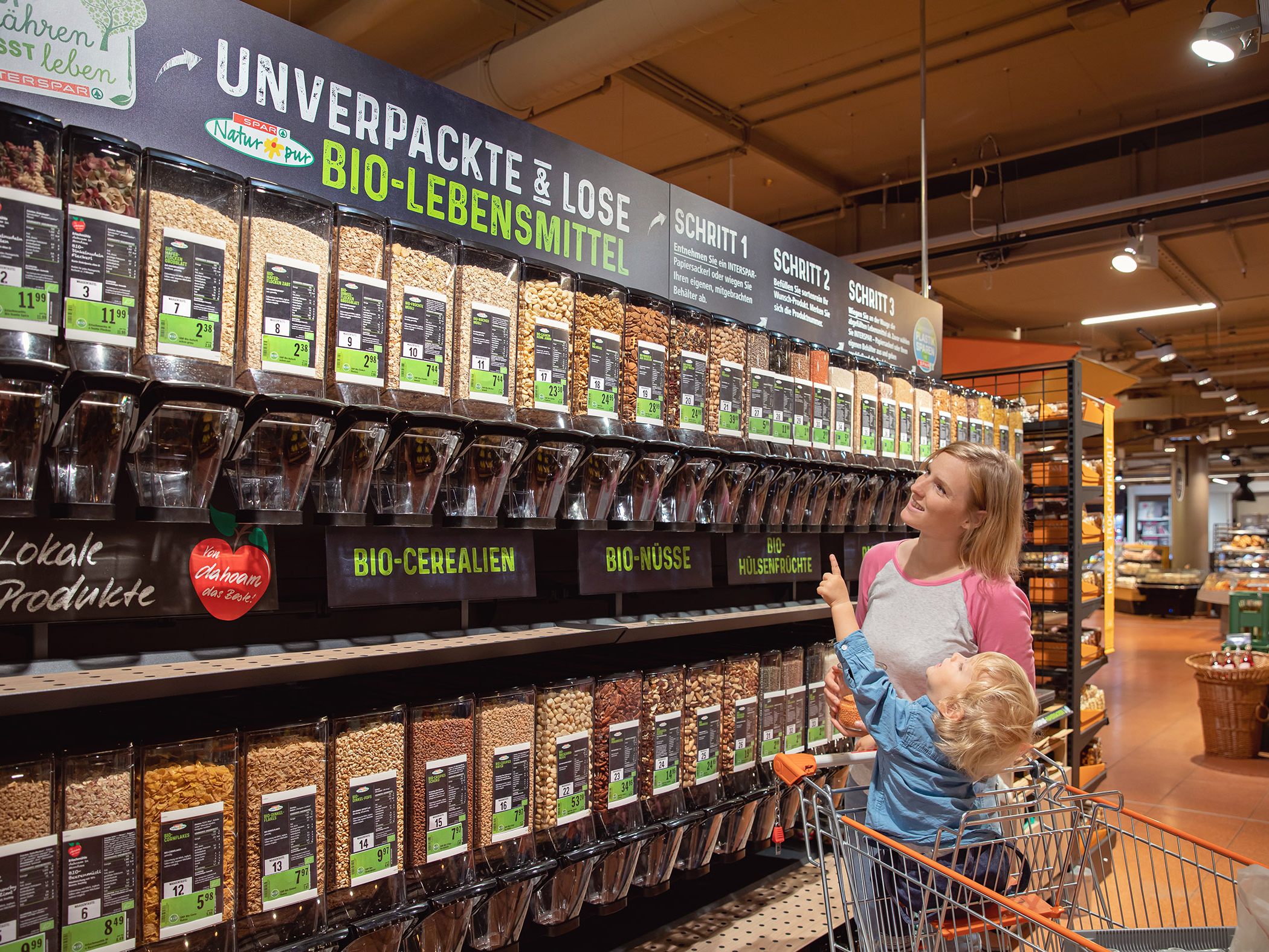 Die Abfüllstation bietet über 40 unverpackte Lebensmittel in Bio-Qualität. Darunter Müslis und Cerealien, aber auch Superfoods wie Nüsse, Kerne sowie Hülsen- und Trockenfrüchte oder Pasta und Reis. Die Kunden können ihr eigenes Gefäß mitbringen, dieses vorher leer abwiegen und anschließend befüllen. Dazu einfach Gefäß unterstellen und den Hebel drücken bis die gewünschte Menge abgefüllt ist. Das Gewicht des Gefäßes wird beim Verwiegen wieder abgezogen. Alternativ können Kunden auch ein Gratis-Papiersackerl für ihren Einkauf verwenden.w