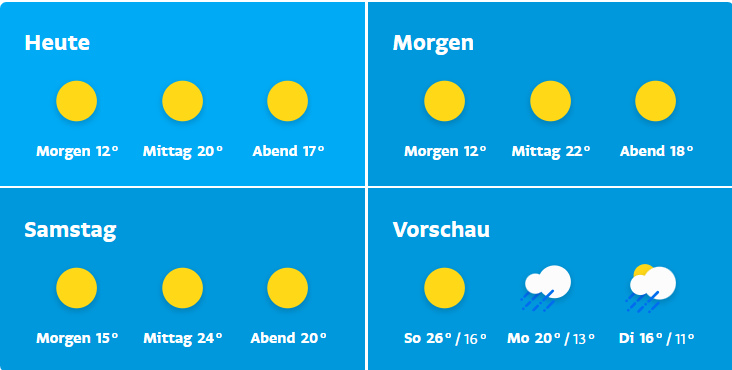 Am Donnerstag lösen sich letzte Wolken rasch auf. Danach präsentiert sich das Wetter im ganzen Land ungetrübt sonnig. Die Höchstwerte liegen zwischen 21 und 25 Grad, am Morgen werden 8 bis 12 Grad gemessen.