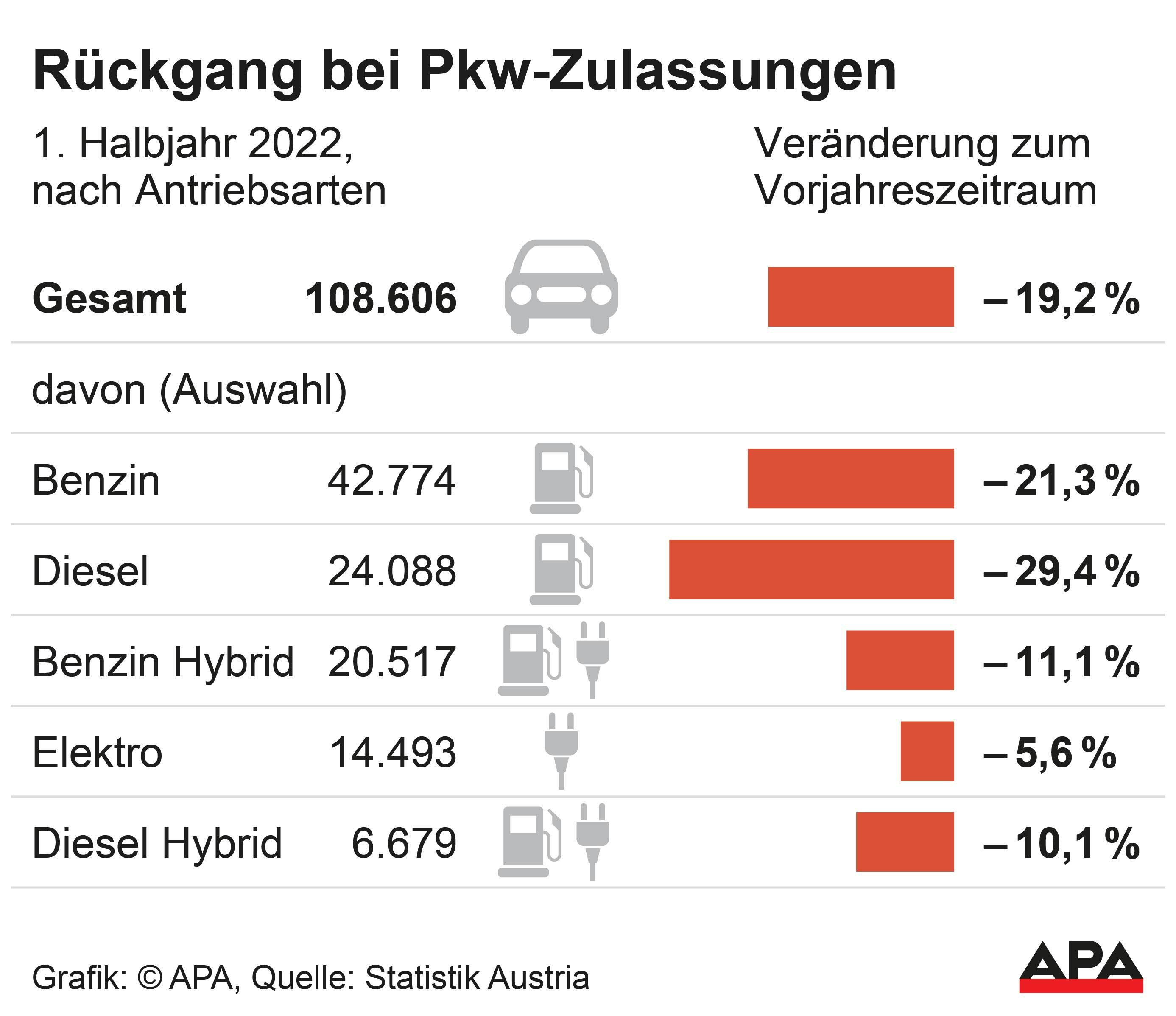 Den stärksten Einbruch gab es bei Neuwagen mit Dieselantrieb. Im Vergleich zum ersten Halbjahr 2021 gingen diese um rund 29 Prozent zurück. Bei Benzinern betrug der Rückgang etwa 21 Prozent. Die Neuzulassungen von Autos mit Benzin-Hybrid brachen um 11 Prozent ein, jene mit Diesel-Hybrid gingen um 10 Prozent zurück. Auch bei reinen Elektroautos gab es einen Rückgang um 5,6 Prozent.