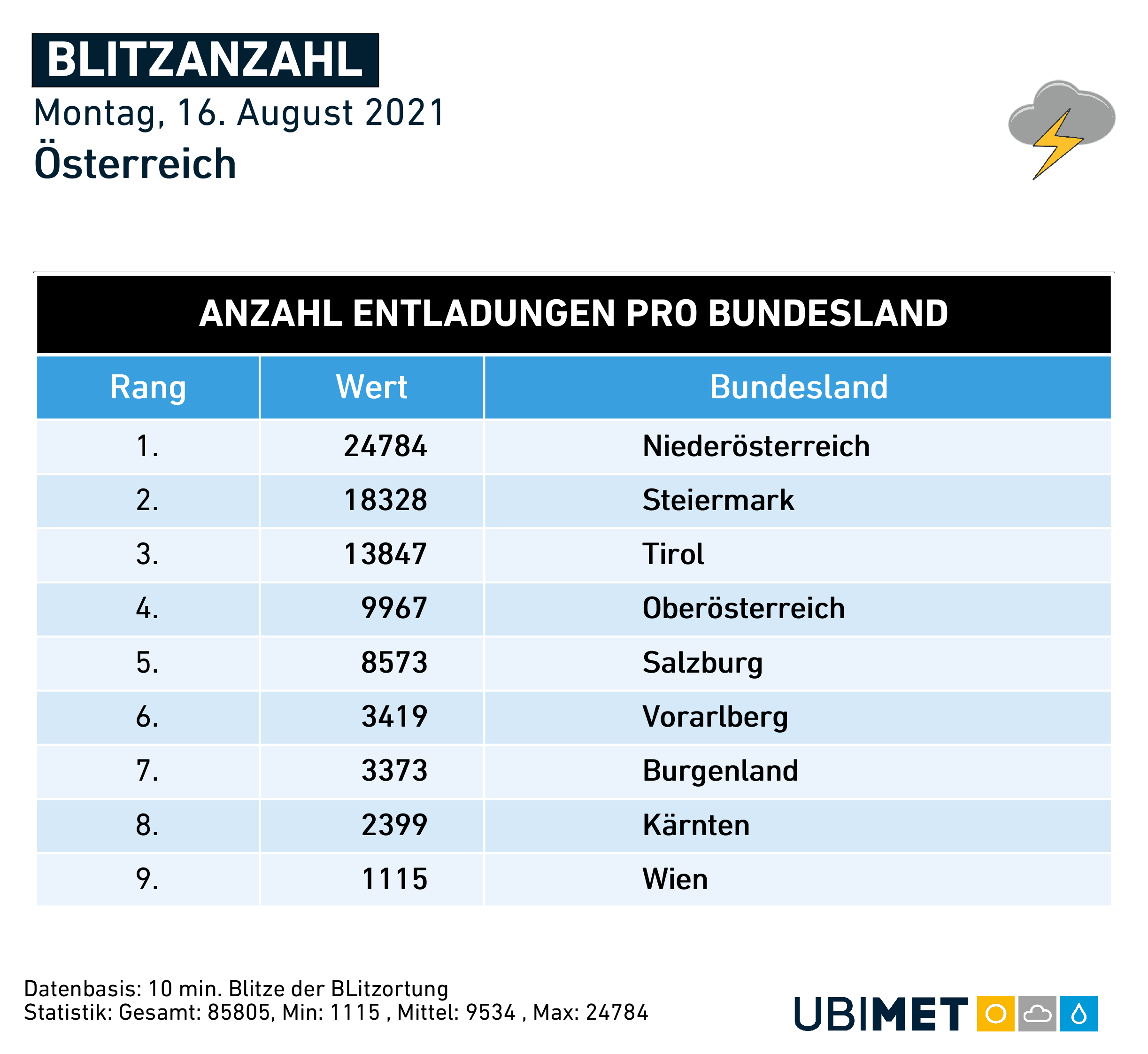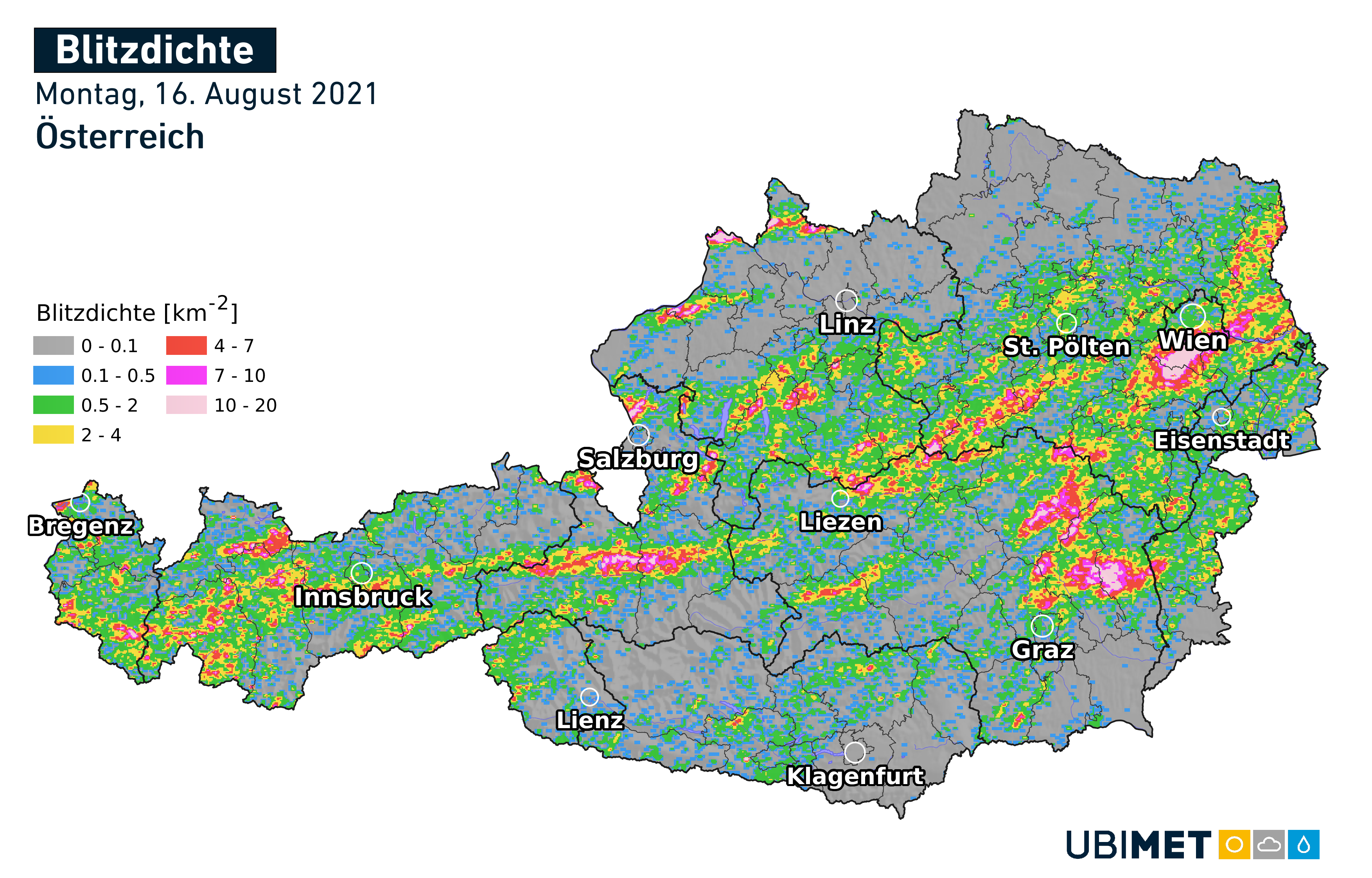 "Damit reiht sich der gestrige Montag österreichweit auf Platz 3 der blitzreichsten Tage in diesem Jahr, nur Tags zuvor am 15. August sowie am 25. Juli wurden noch mehr Blitze gemessen“, berichtet der Chefmeteorologe der Unwetterzentrale, Manfred Spatzierer. "Bei der Blitzdichte auf Bundeslandebene liegt Wien in Führung, der Bezirk mit der höchsten Blitzdichte liegt mit Mödling hingegen in Niederösterreich.“