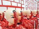 “Ich wehre mich gegen die Diktatur der Tatsachen”, so Hirschhorn bei der heutigen Presseführung. “Das Auge hat keine Informationen, es bewertet nicht, es sieht nur.” Natürlich ist Blut nicht das einzige Rot auf der Welt, da hängen auch Fahnen, da liegen Cola-Dosen herum, da tragen Schaufensterpuppen grelle Perücken. Aber ein wertungsfreier Blick, der nur rot sieht, muss auf dieser Welt in jedem Fall ein Blutbad anrichten.