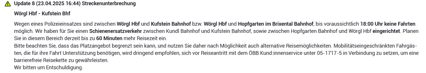 Kurz nach Bekanntwerden der Sperre wurde ein Schienenersatzverkehr für den Fern- und Regionalverkehr eingerichtet. Zwischen Kufstein und Wörgl wurden Busse organisiert, ab dem Bahnhof Wörgl war eine Weiterfahrt mit dem Zug in Richtung Innsbruck möglich. Von Wörgl bis Hopfgarten im Brixental wurde ebenfalls ein Schienenersatzverkehr eingerichtet. ÖBB-Sprecher Christoph Gasser-Mair wies jedoch darauf hin, dass Reisende rund eine Stunde mehr an Fahrtzeit einplanen sollen.