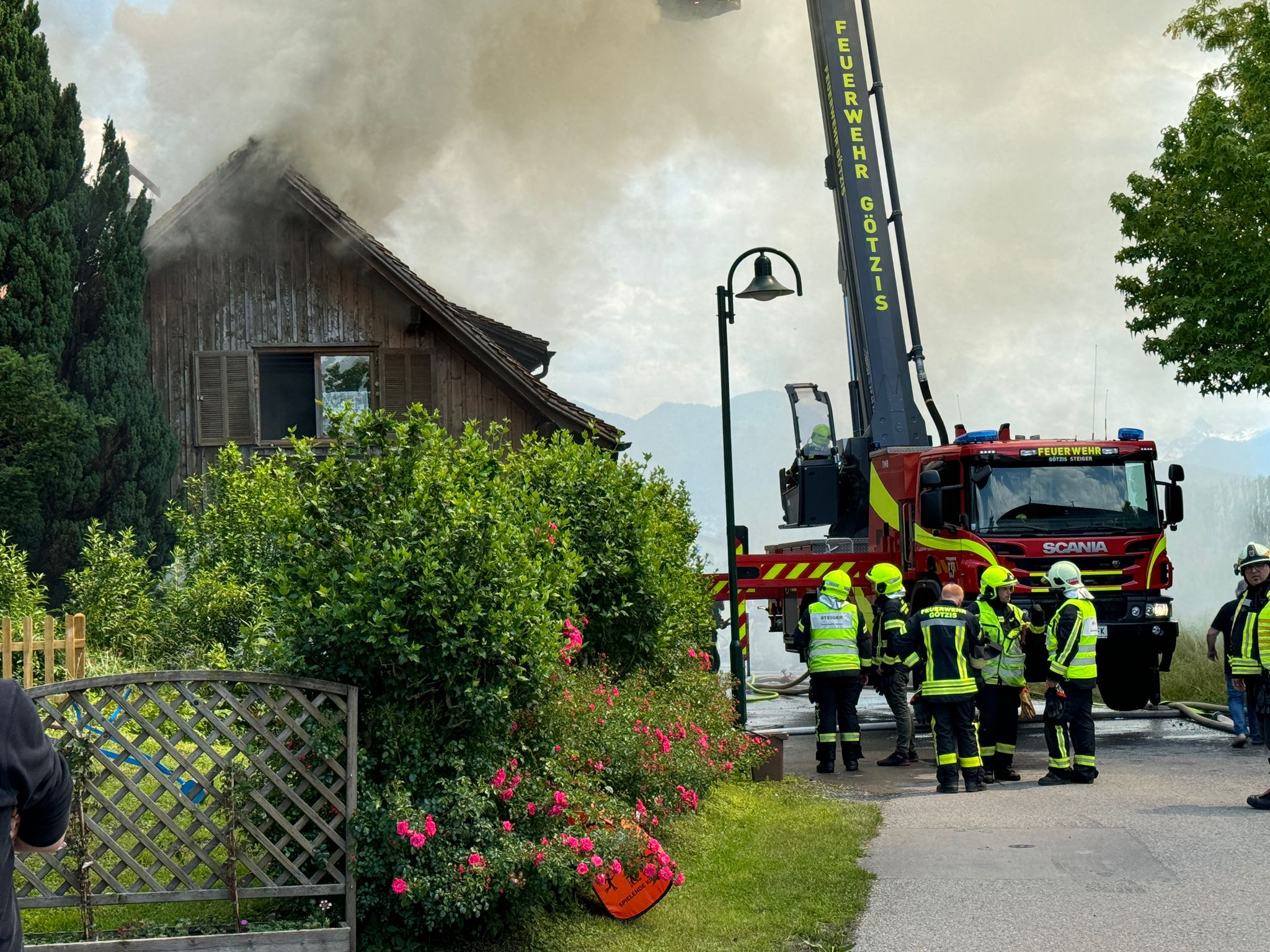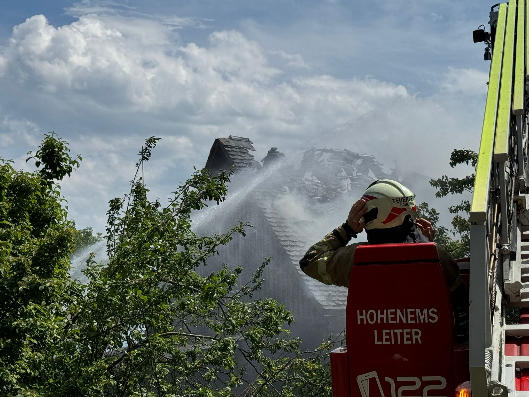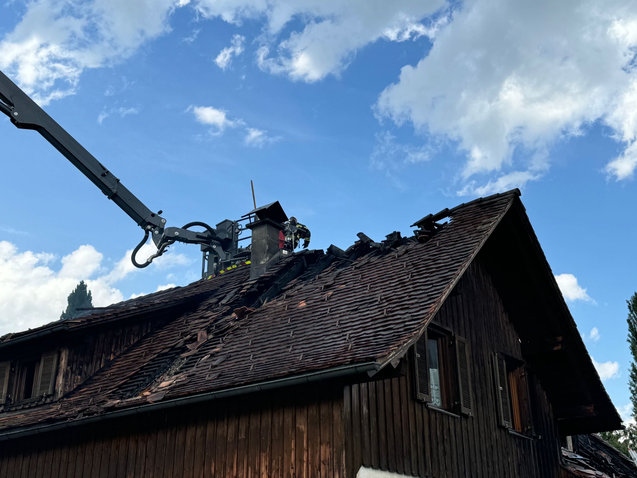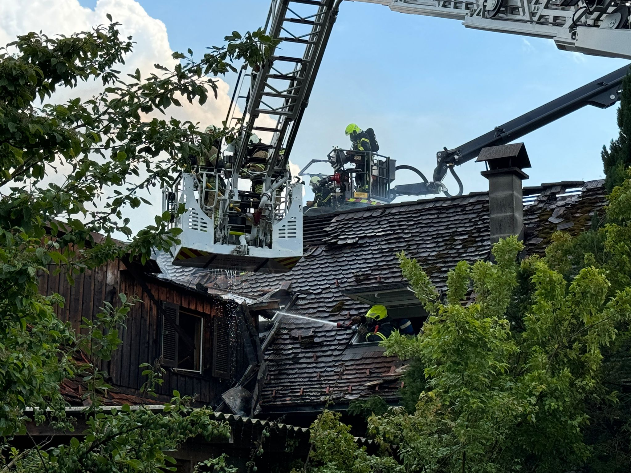 "Wir wurden um 13.43 Uhr zu einem f3 'Schopf in Brand' gerufen. Drei Minuten später gab es eine Stichworterhöhung auf f4 Dachstuhlrand -Hauptgebäude in Vollbrand", erzählt der Einsatzleiter gegenüber VOL.AT. "120 Einsatzkräfte der Feuerwehr waren vor Ort, um den Brand zu bekämpfen." Es gab zwei Verletzte: "Allerdings wegen Kreislaufproblemen, also wetterbedingt", so Bolter.