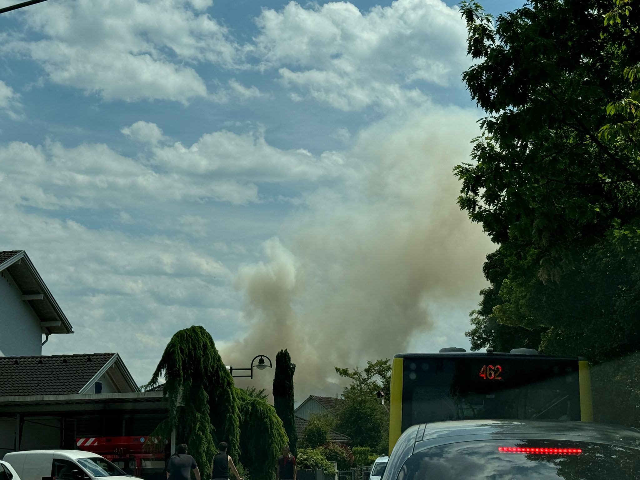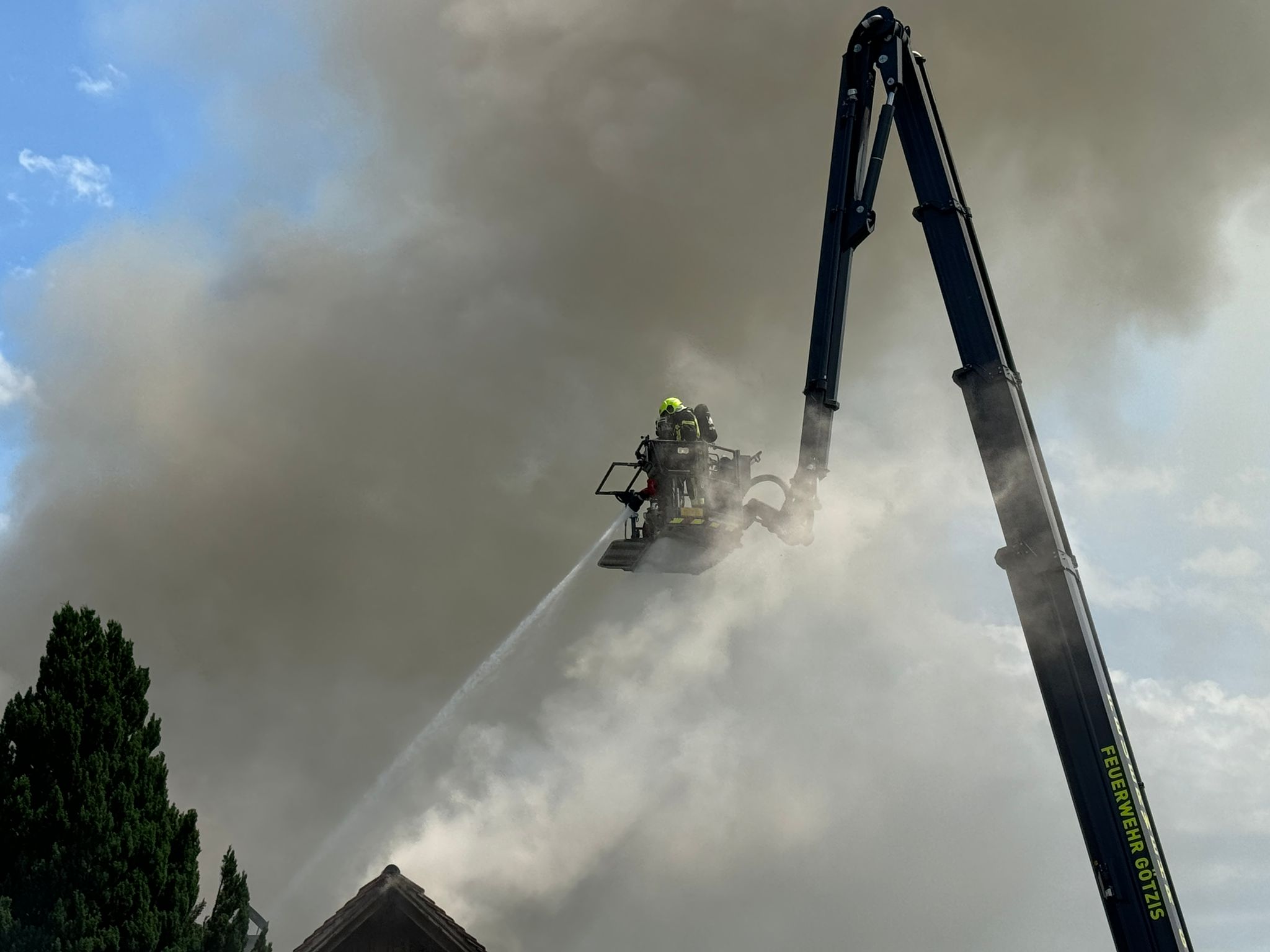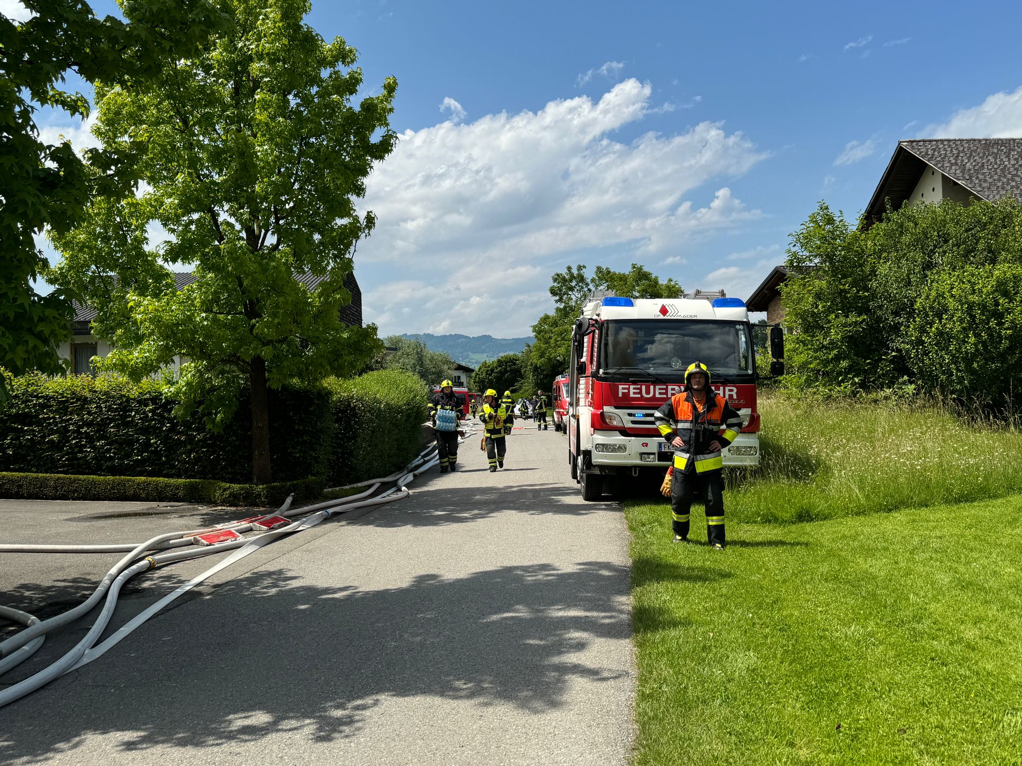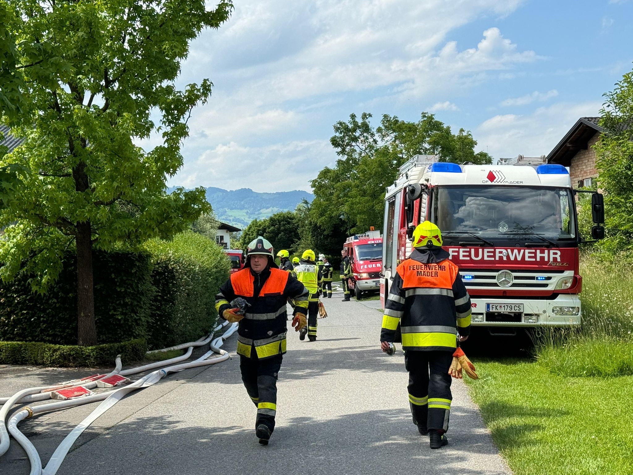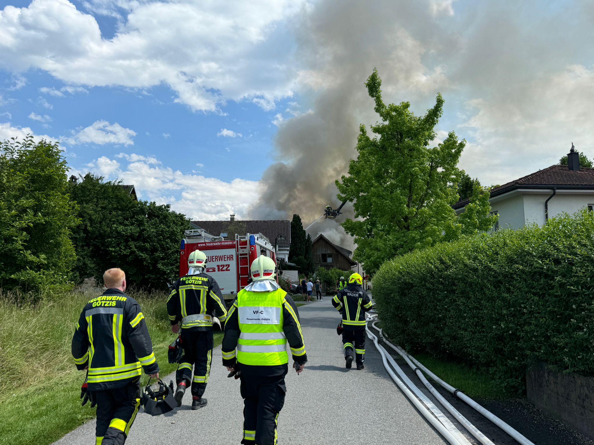 "Wir wurden um 13.43 Uhr zu einem f3 'Schopf in Brand' gerufen. Drei Minuten später gab es eine Stichworterhöhung auf f4 Dachstuhlrand -Hauptgebäude in Vollbrand", erzählt der Einsatzleiter gegenüber VOL.AT. "120 Einsatzkräfte der Feuerwehr waren vor Ort, um den Brand zu bekämpfen." Es gab zwei Verletzte: "Allerdings wegen Kreislaufproblemen, also wetterbedingt", so Bolter.