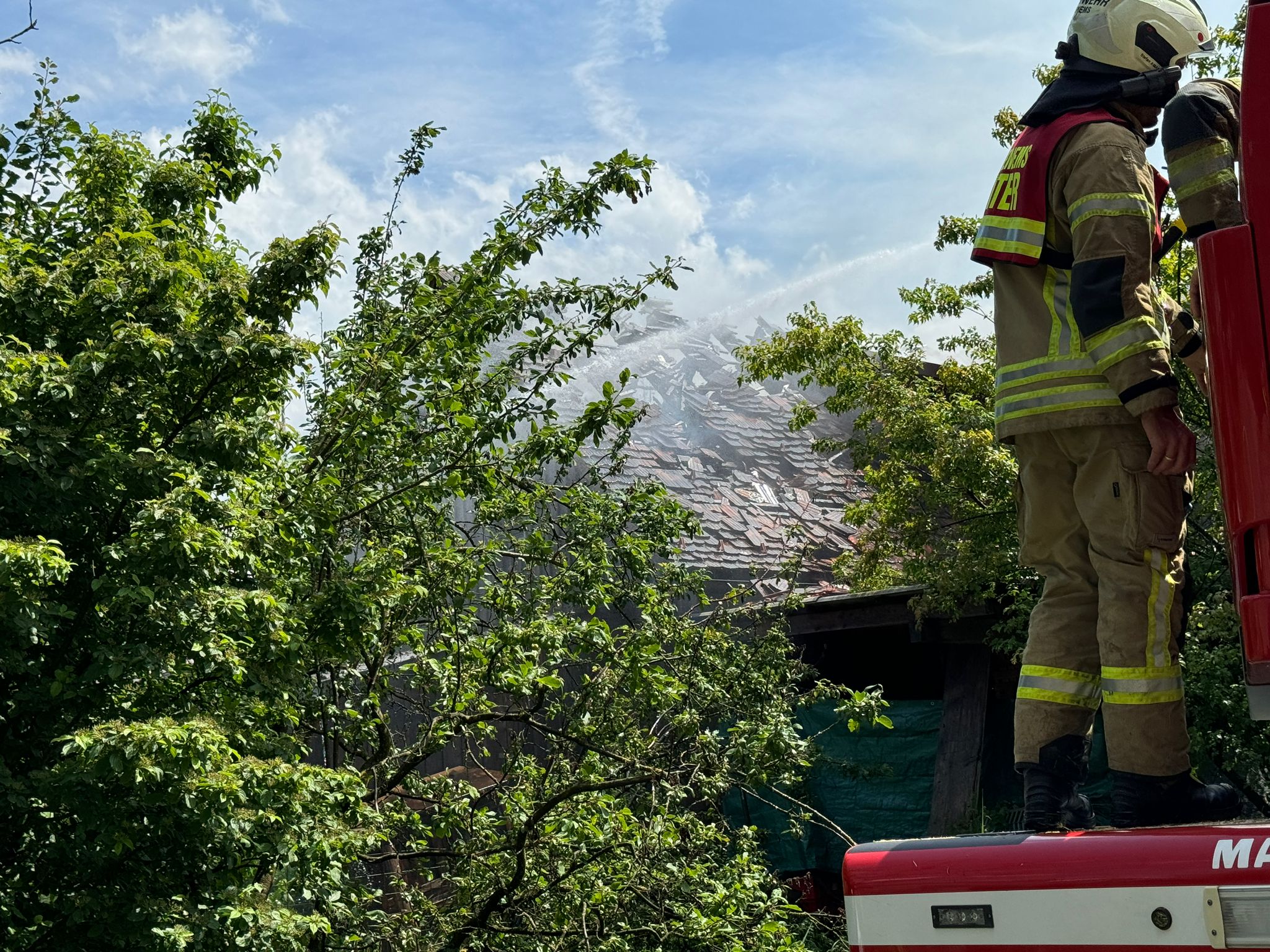 Am Schopf bzw. am Wohnhaus entstand ein erheblicher Sachschaden, sodass das Haus unbewohnbar wurde.
