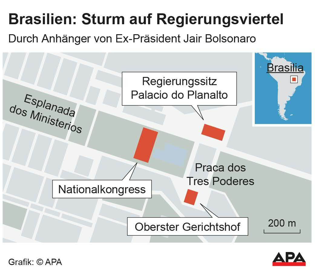 Der deutsche Kanzler Olaf Scholz sprach von einem "Angriff auf die Demokratie". "Was in Brasilien geschieht, kann uns nicht gleichgültig lassen. Der Angriff auf den Sitz der Institution ist inakzeptabel und mit jeder Form von demokratischem Dissens unvereinbar", schrieb die italienische Regierungschefin Giorgia Meloni. "Demokratische Traditionen müssen von allen respektiert werden", betonte der indische Premier Narendra Modi auf Twitter. Auch lateinamerikanische Staats- und Regierungschefs stellten sich klar gegen die Bolsonaro-Anhänger. Außenminister Alexander Schallenberg (ÖVP) verurteilte die Erstürmung in einem englischsprachigen Tweet "aufs Schärfste". Angriffe auf demokratische Institutionen seien "völlig inakzeptabel". Die Verursacher müssten zur Rechenschaft gezogen werden.