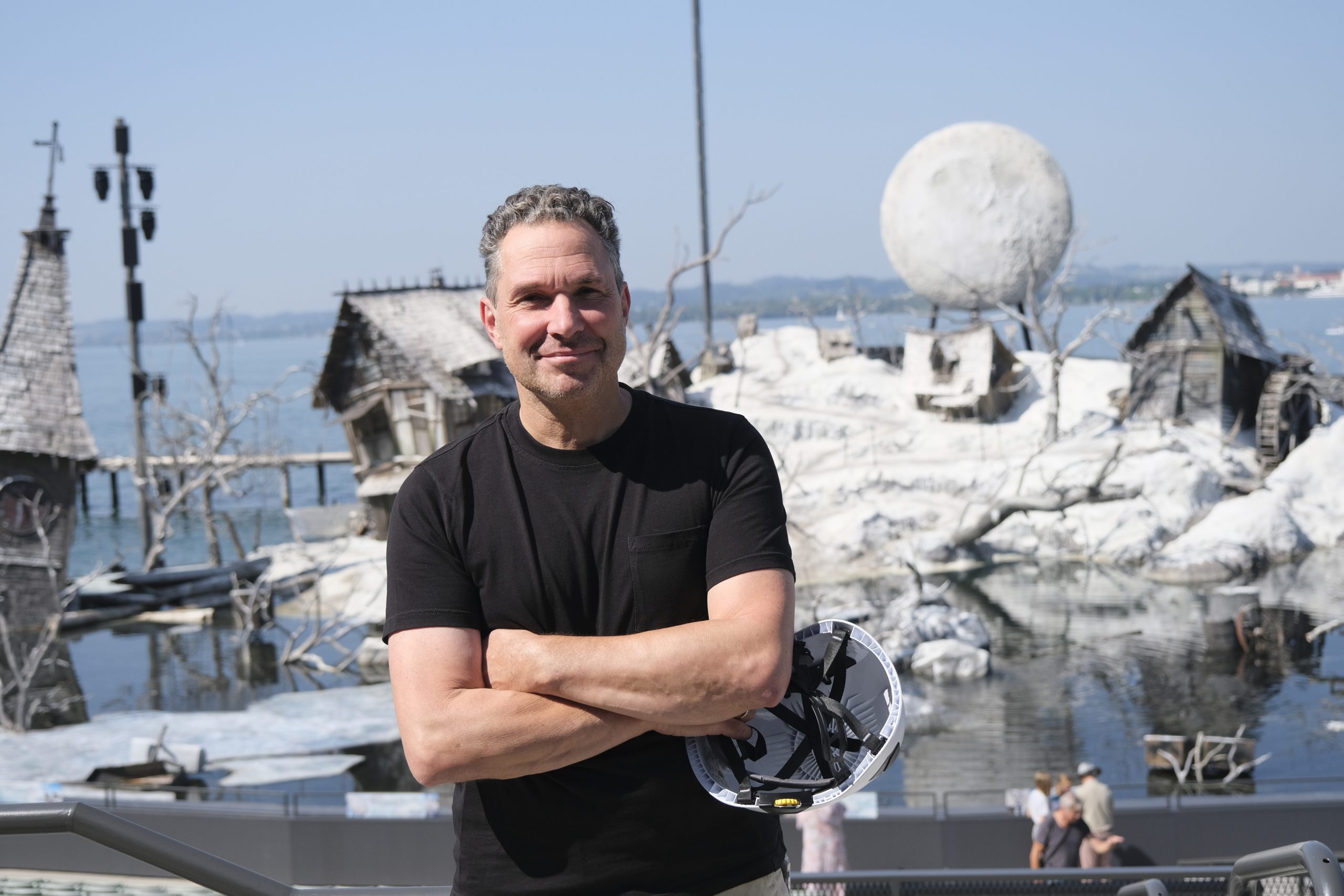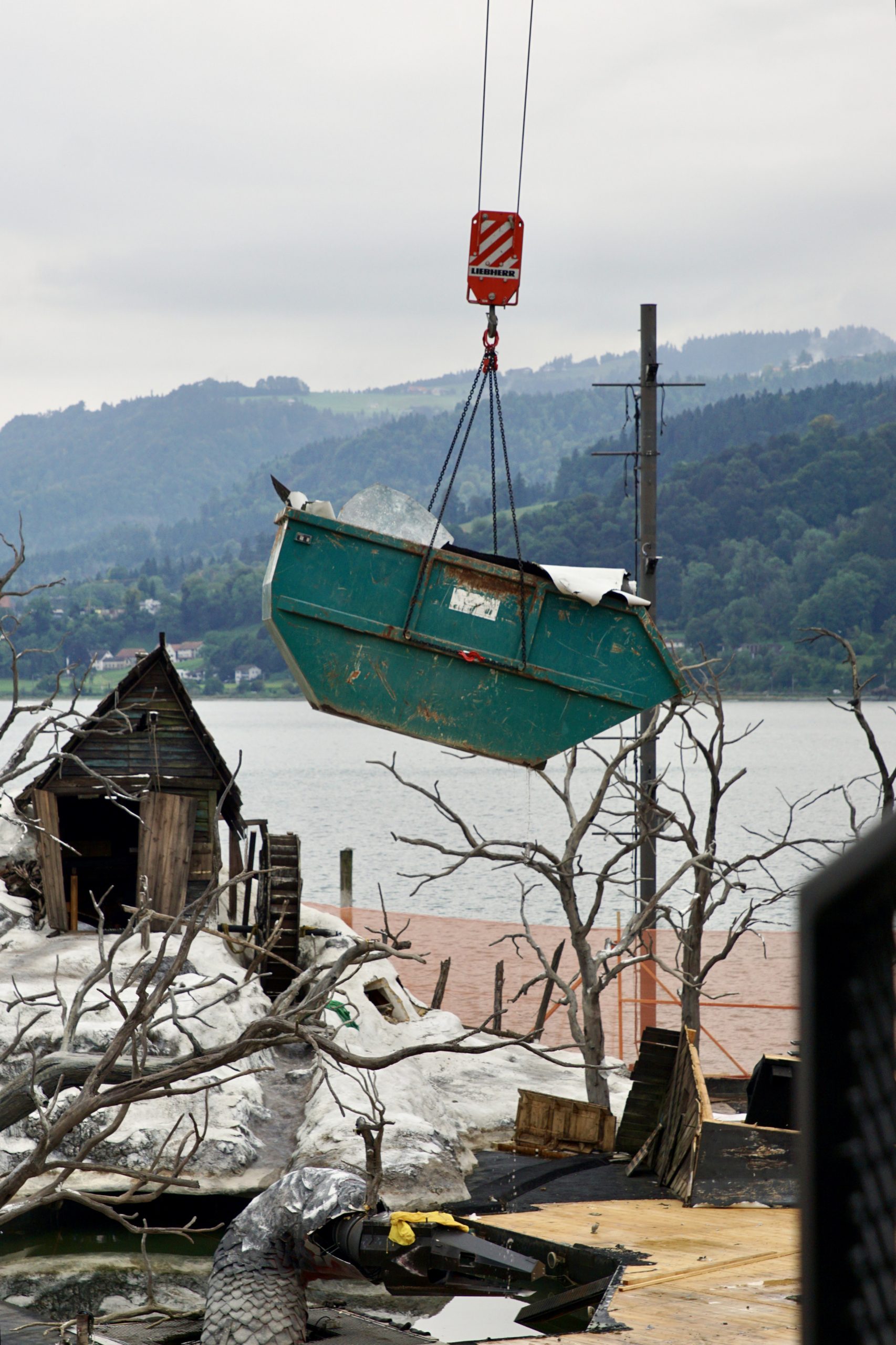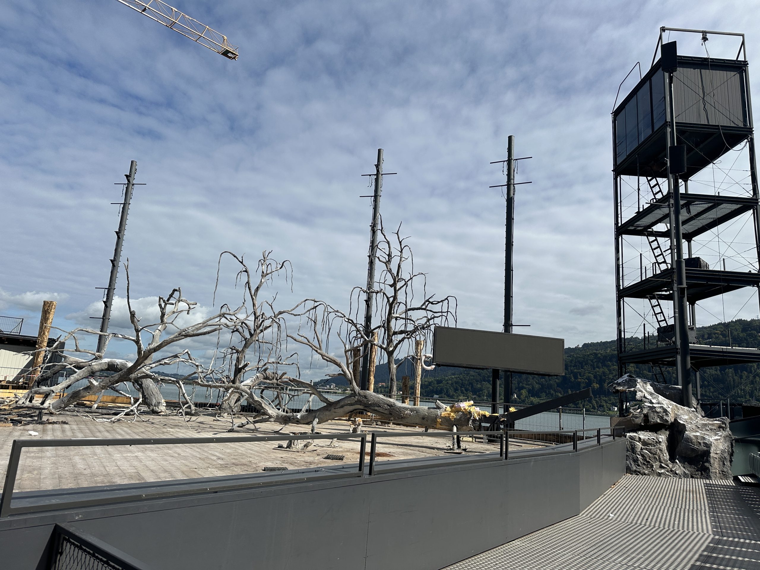 Beim VOL.AT-Lokalaugenschein zeigt sich ein völlig anderes Bild: Statt Opernzauber dominiert die Baustellenstimmung. Wo das verfallene Dorf aus dem Dreißigjährigen Krieg stand, liegen heute aufgestapelte Bühnenbildelemente. Die Häuser, der Kirchturm und die Kutsche sind Geschichte. Nur wenige Elemente – etwa einige Bäume am rechten Bühnenrand oder der mit Bauzäunen abgesperrte Bereich des ehemaligen Wasserbeckens – erinnern noch an das Bühnenbild.