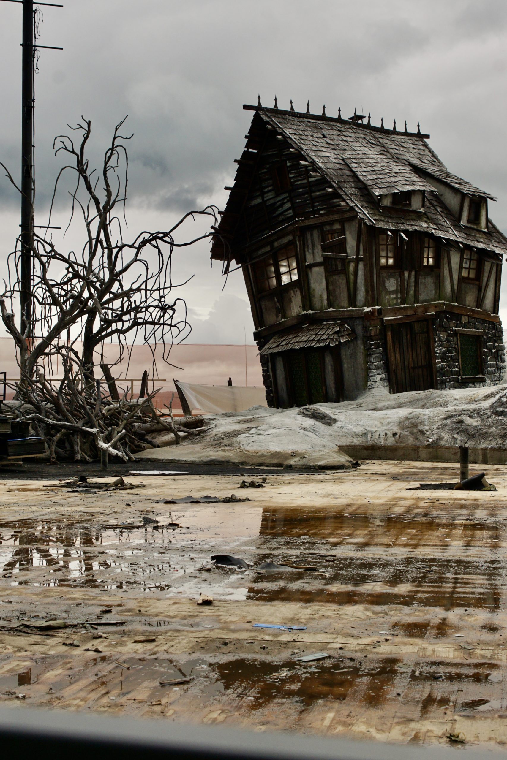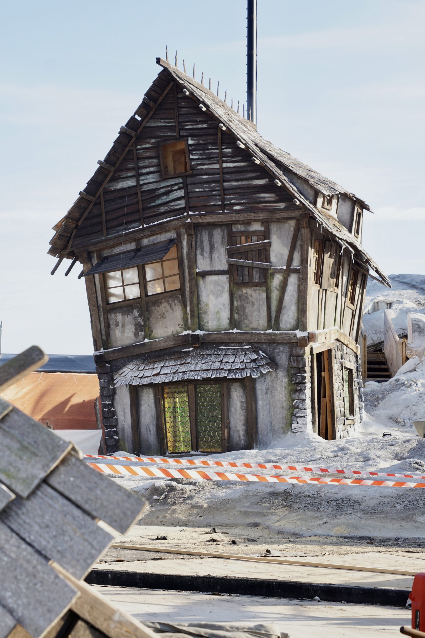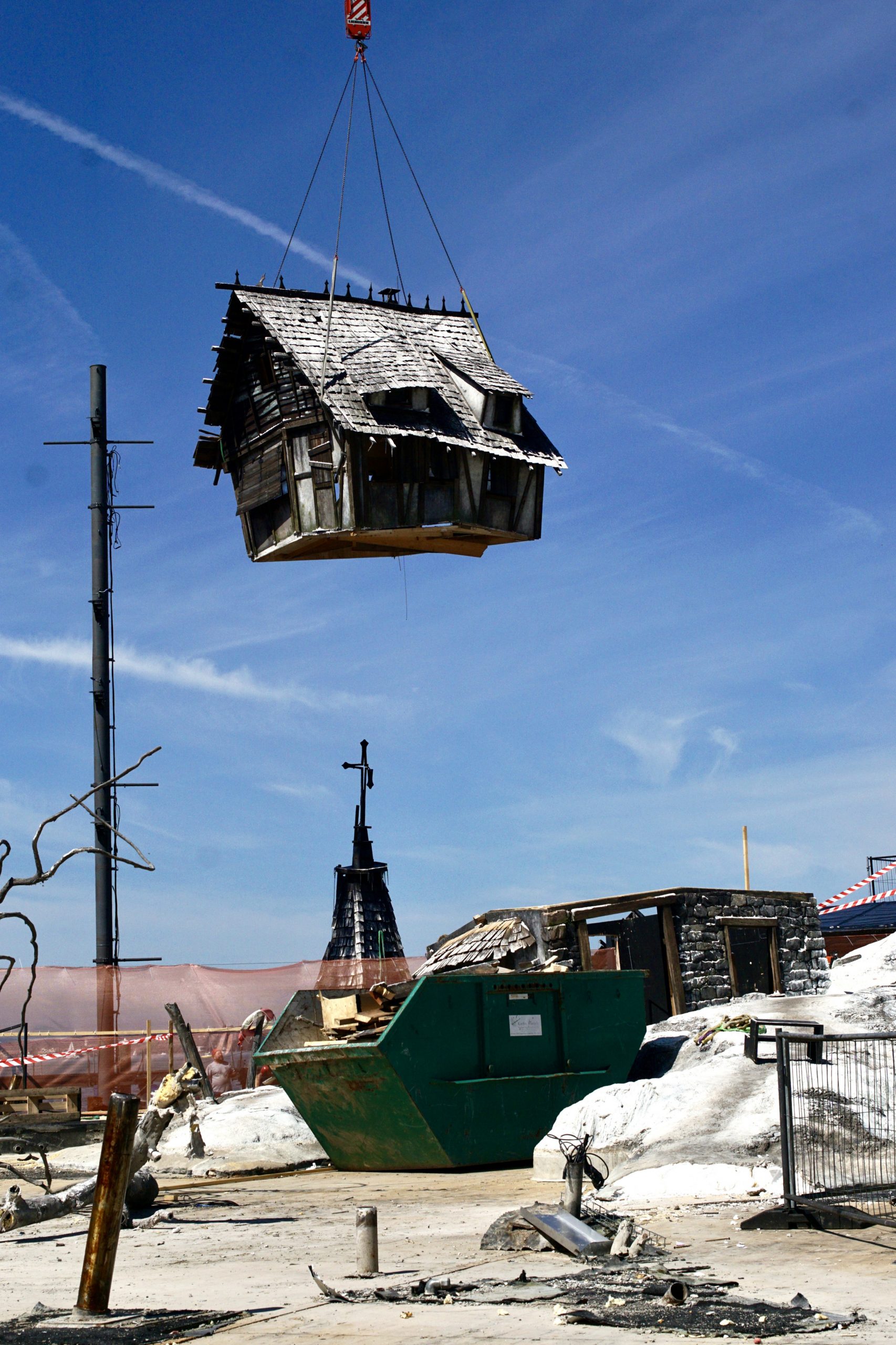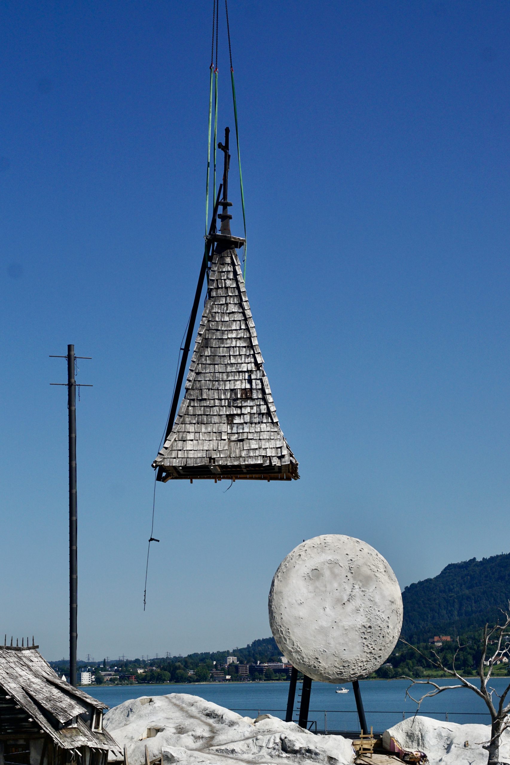 Beim VOL.AT-Lokalaugenschein zeigt sich ein völlig anderes Bild: Statt Opernzauber dominiert die Baustellenstimmung. Wo das verfallene Dorf aus dem Dreißigjährigen Krieg stand, liegen heute aufgestapelte Bühnenbildelemente. Die Häuser, der Kirchturm und die Kutsche sind Geschichte. Nur wenige Elemente – etwa einige Bäume am rechten Bühnenrand oder der mit Bauzäunen abgesperrte Bereich des ehemaligen Wasserbeckens – erinnern noch an das Bühnenbild.