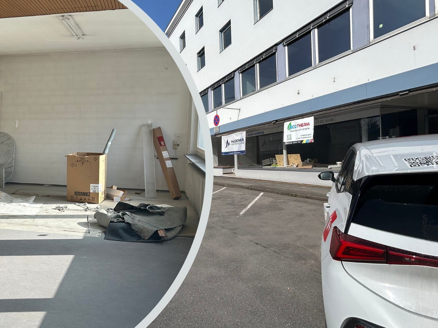 Ein Transparent mit der Aufschrift "Gewerbeflächen zu vermieten" ist gut sichtbar an dem Gebäude in der Bregenzer Rheinstraße angebracht. Dieses Transparent ist bereits vielen Passanten und Autofahrern aufgefallen, da sie täglich an dem markanten Gebäude vorbeigehen oder daran vorbeifahren.