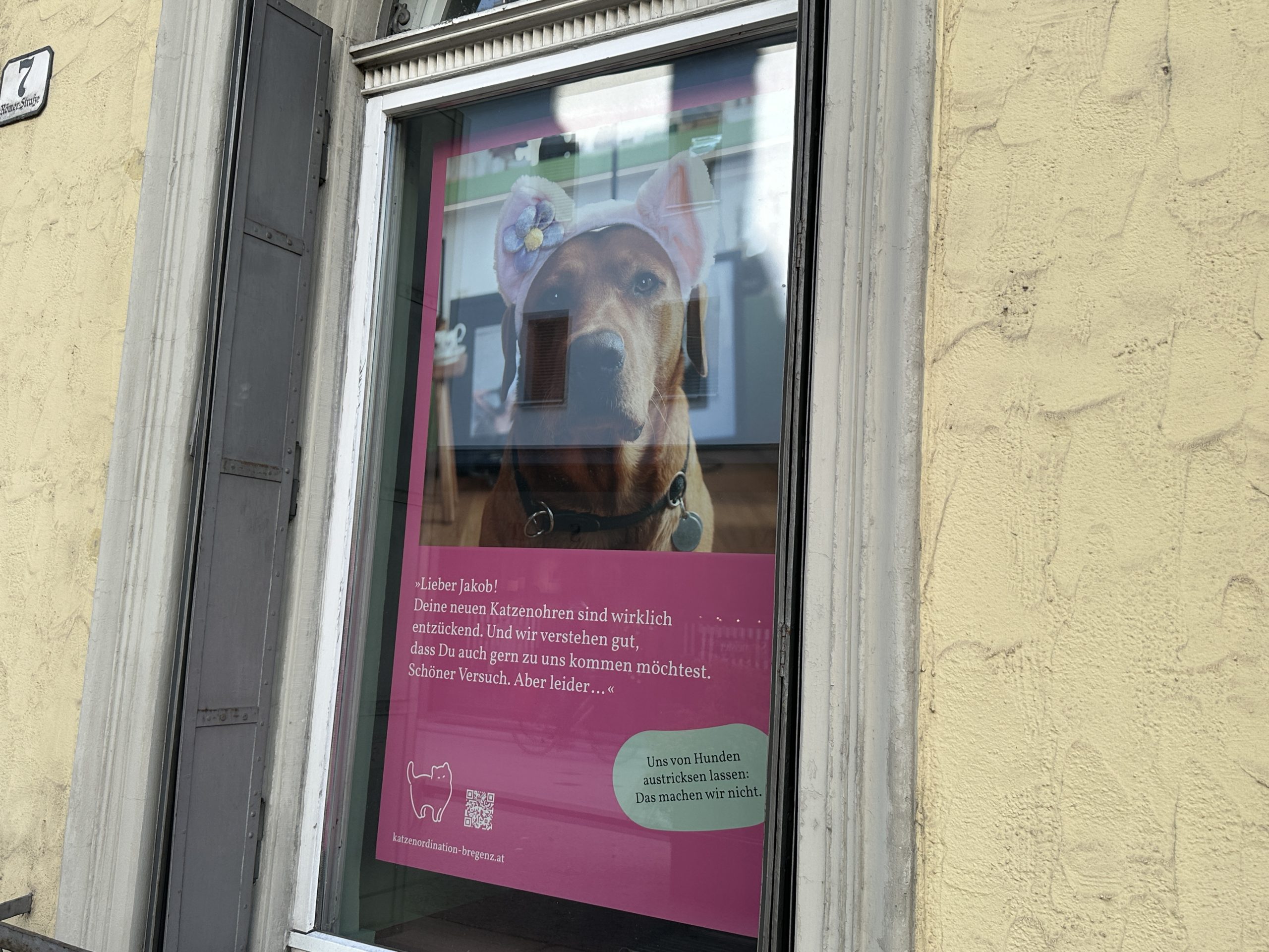 Auch zwei Hunde im Katzenkostüm haben sich eingeschlichen: "Lieber Jakob! Deine neuen Katzenohren sind wirklich entzückend. Und wir verstehen gut, dass Du auch gern zu uns kommen möchtest. Schöner Versuch. Aber leider…", steht da etwa.