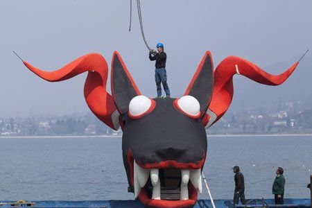 Bühnenbauer trotzten Winterwetter - Erster der drei Drachenhunde erhielt seinen Kopf. ©Bregenzer Festspiele/ Lisa Mathis