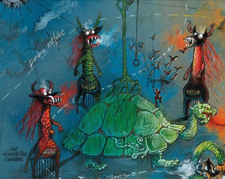In den kommenden Tagen soll der 20 Tonnen schwere Drachenhund mit einem langen Schweif, einer wilden Mähne und Vorderpfoten komplettiert werden. Die von Johan Engels stammende Kulisse (siehe Originalzeichnung) für die von Intendant David Pountney inszenierte Mozart-Oper besteht im Kern aus einer an eine Schildkröte erinnernden Kuppel und drei Drachenhunden, die “Weisheit”, “Vernunft” und “Natur” verkörpern: