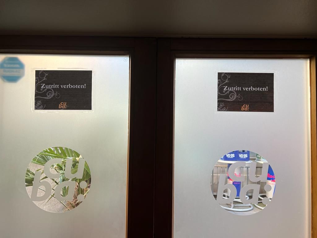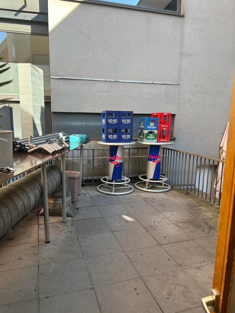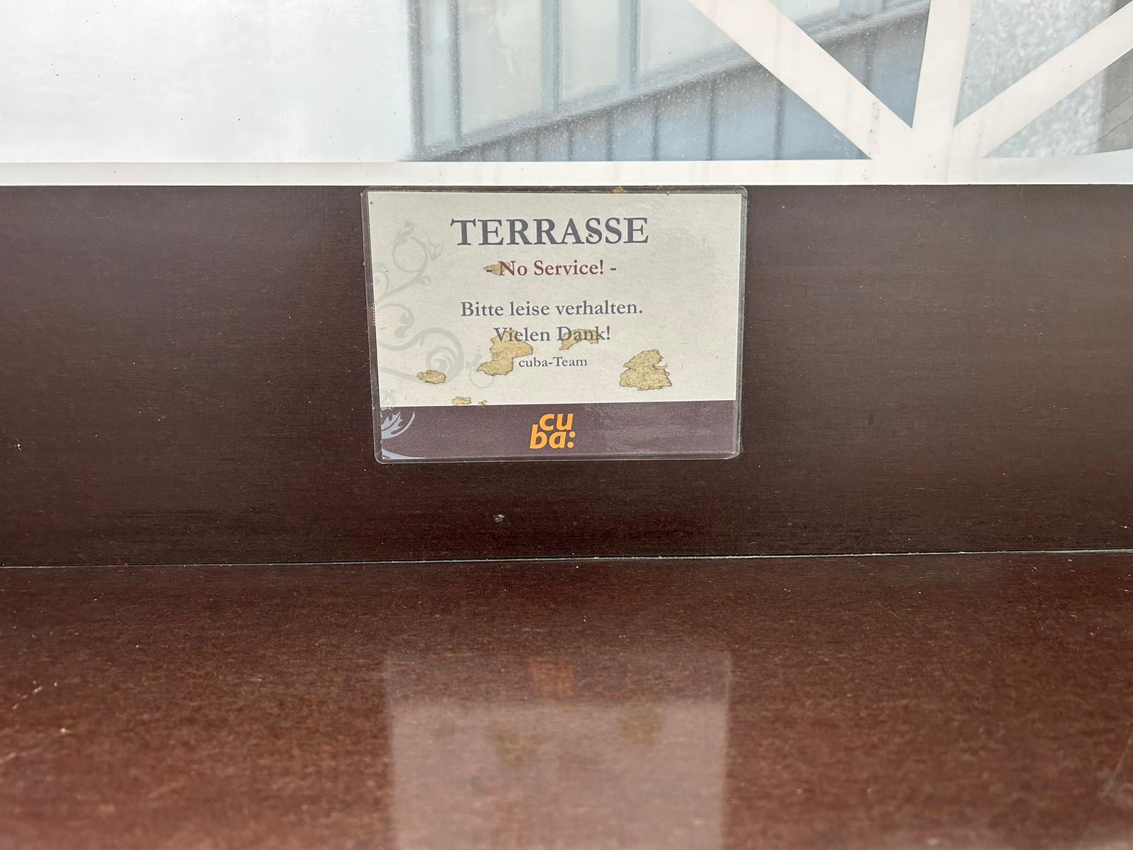 Im Innenbereich befand sich eine Theke (welche beschriftet ist mit: "TERRASSE, - No Service -, Bitte leise verhalten"), 2 Stehtische und 3 kleine Hocker, welche den Gästen die Möglichkeit bot, sich für ihre Rauchpause hinzusetzen.