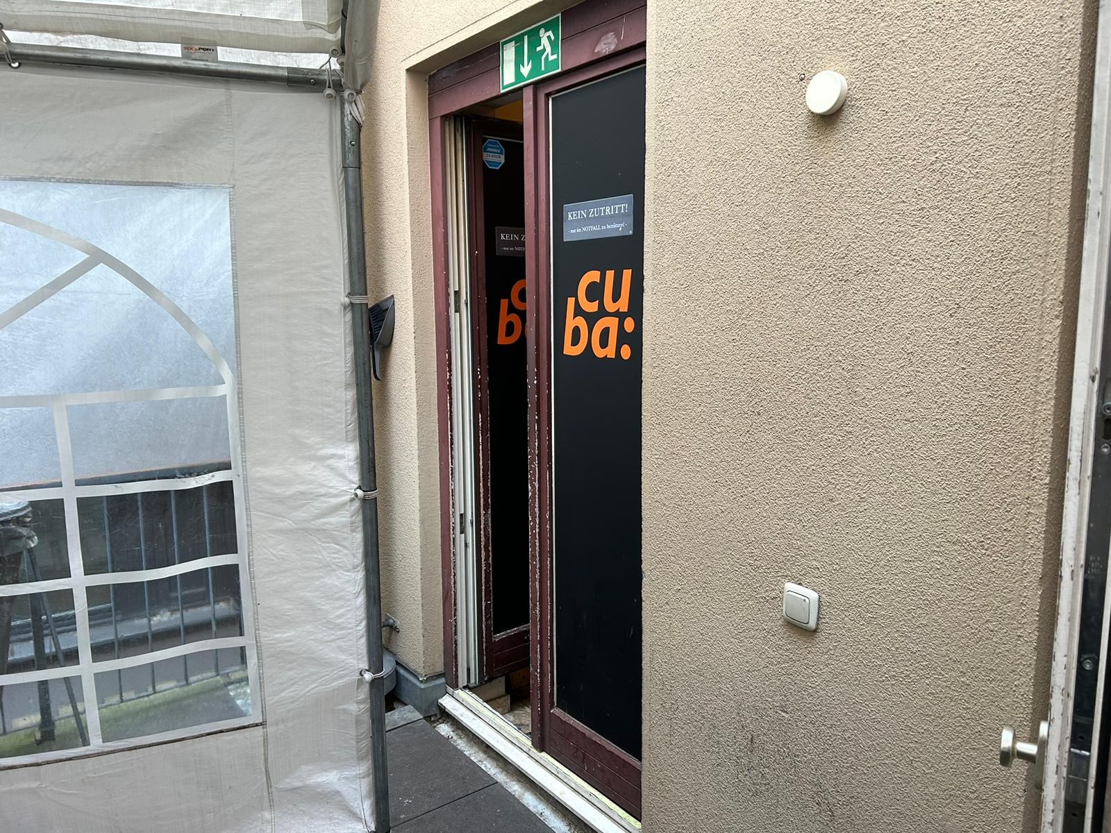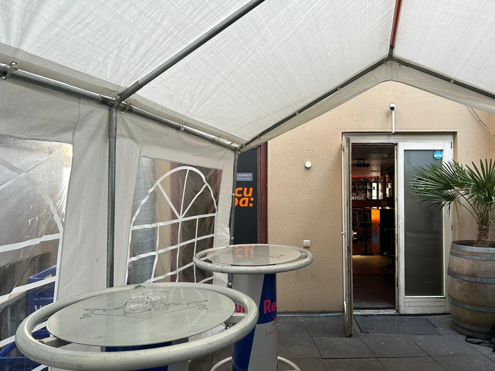 Das 3x4 Meter lange Zelt wurde auf dem Balkon der Cuba: Bar aufgestellt, hierbei wurden die rechten Steher für mehr Sicherheit am Boden mit Schrauben fixiert. Der Notausgang wurde dabei freigehalten.