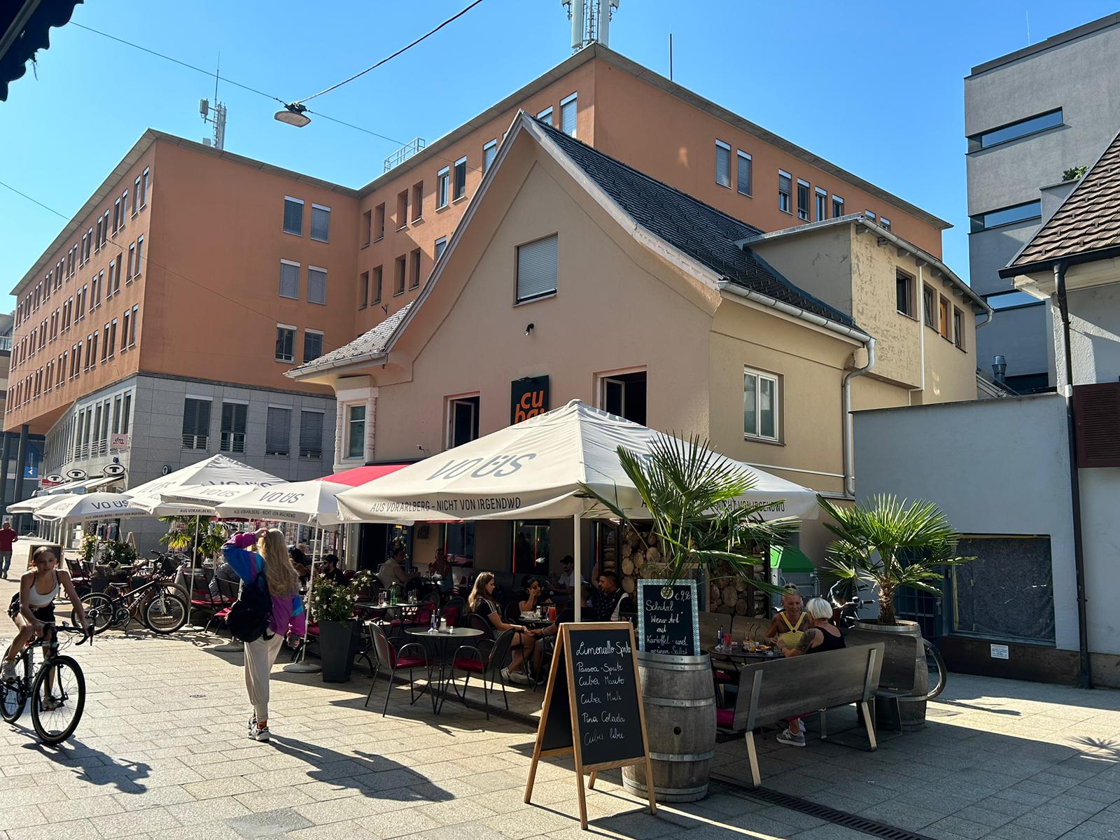 Herr Albrecht möchte noch dazusagen, dass er den Lärm der durch rauchende Gäste zwangsläufig entsteht, nicht vor der Eingangstüre mitten in der Fußgängerzone haben wollte. Somit entstand 2019 die Idee eines nichtbewirteten Raucherzelt auf der Terrassenfläche im ersten Obergeschoss.