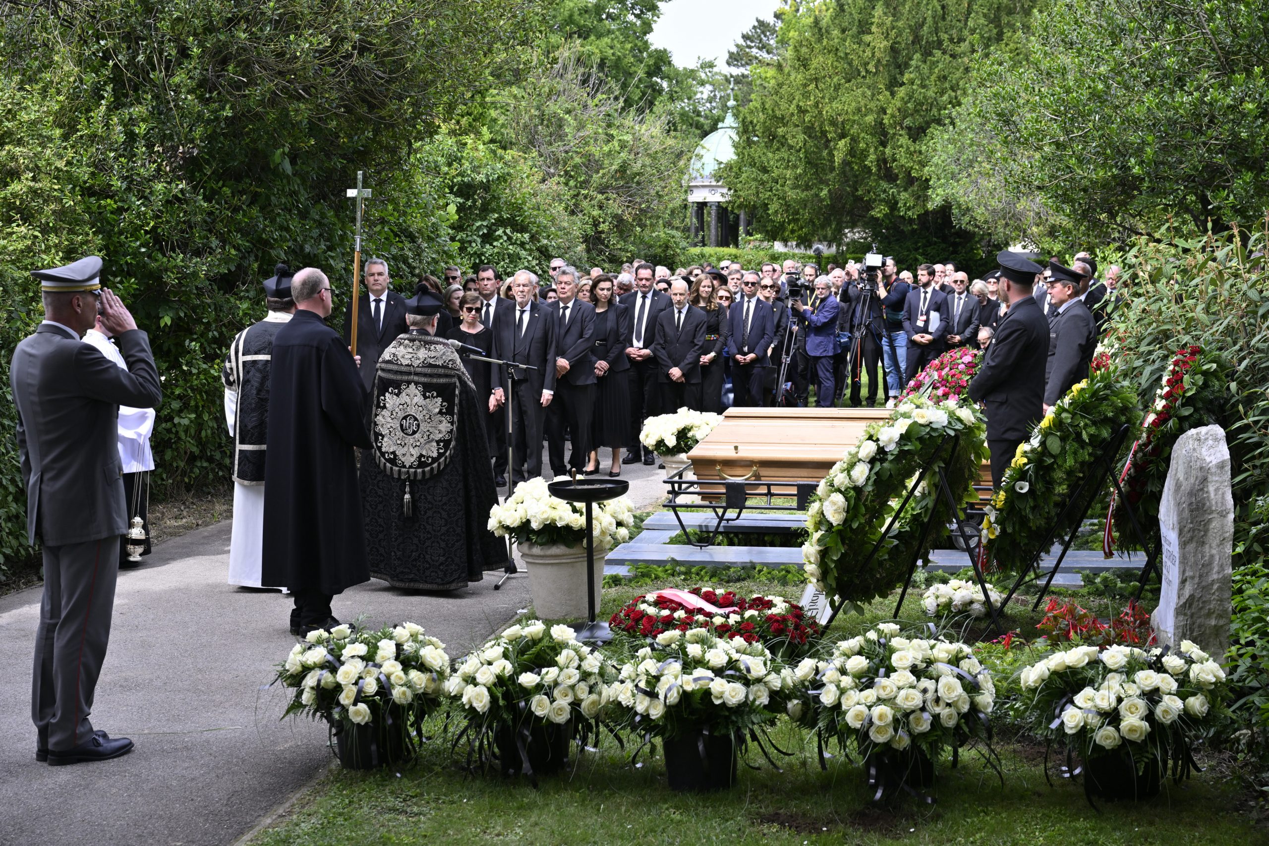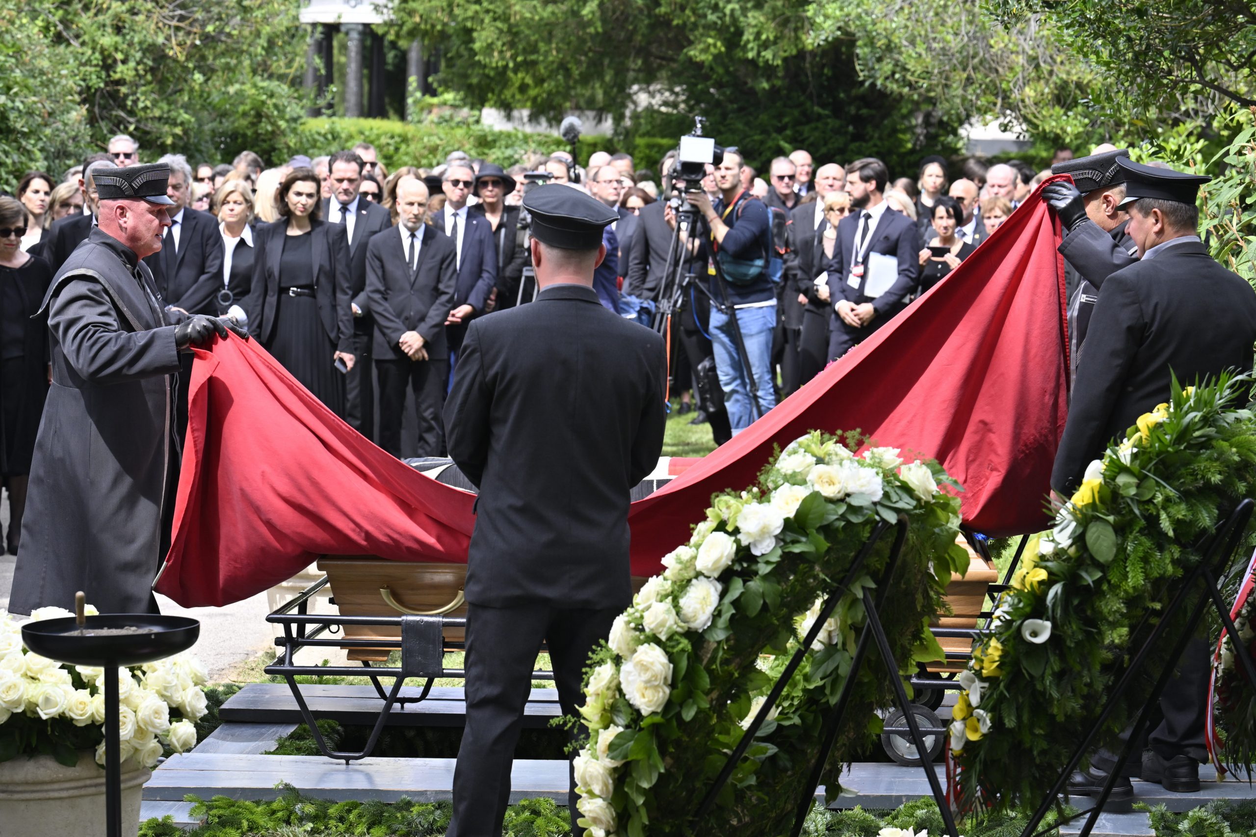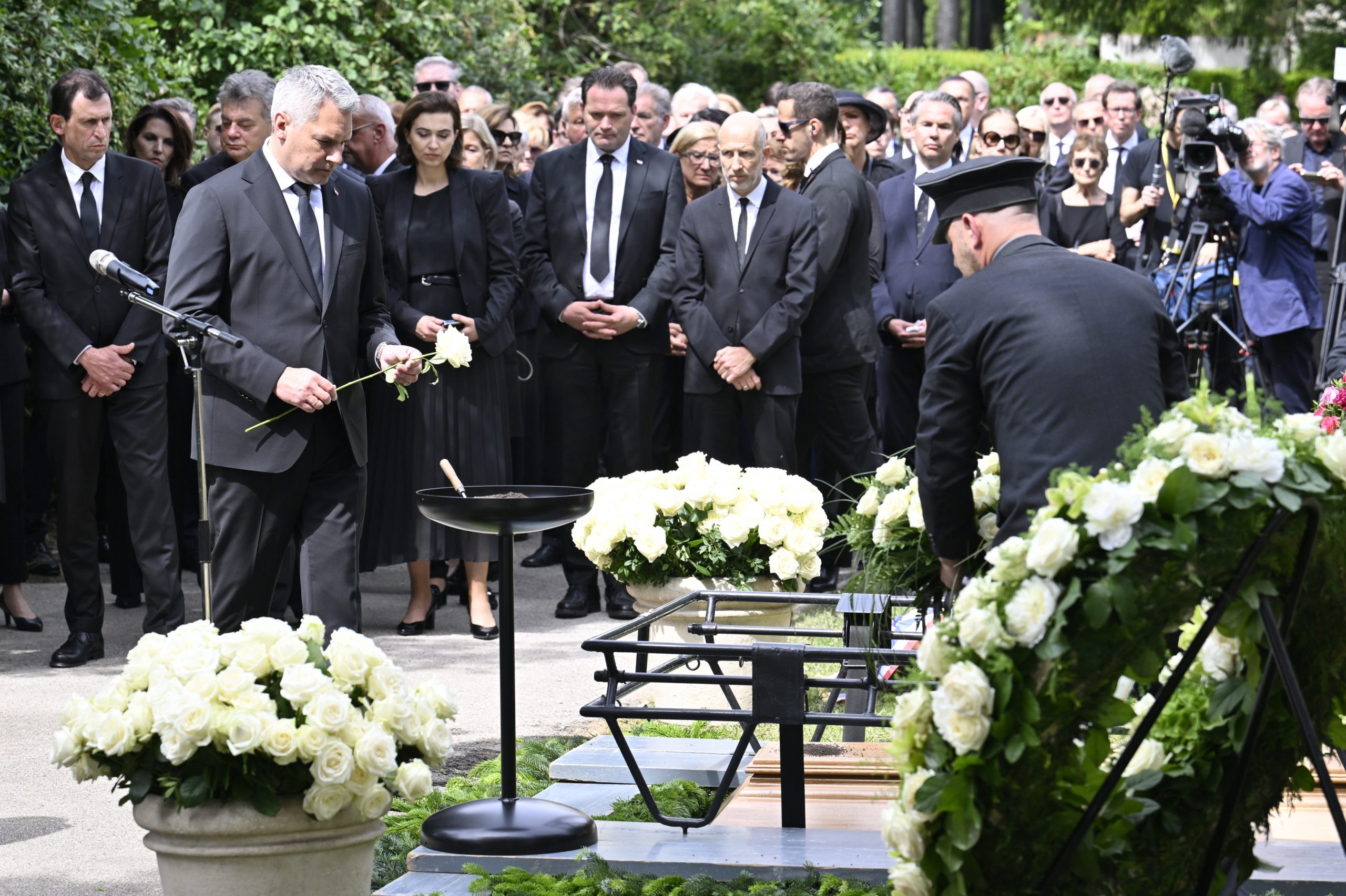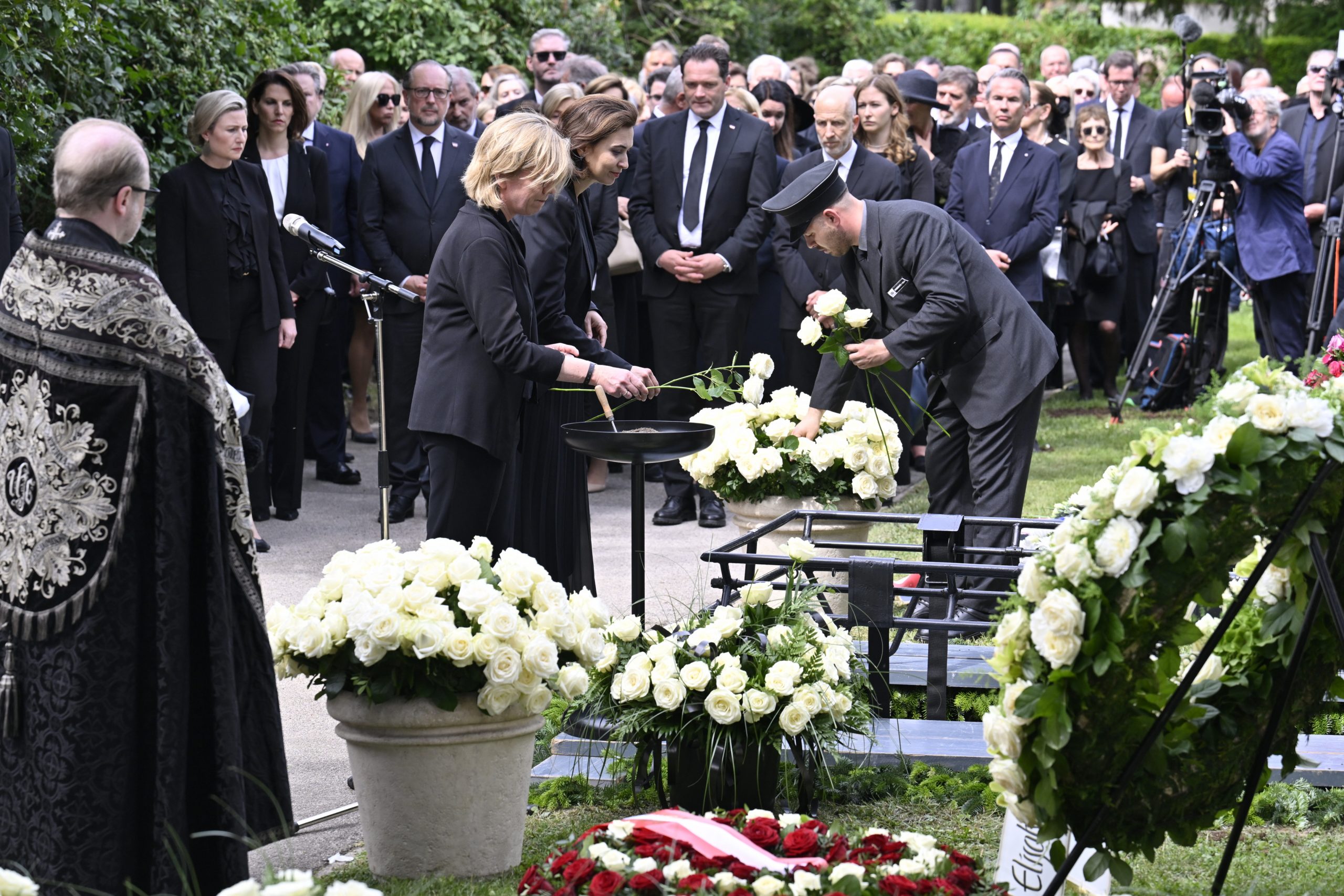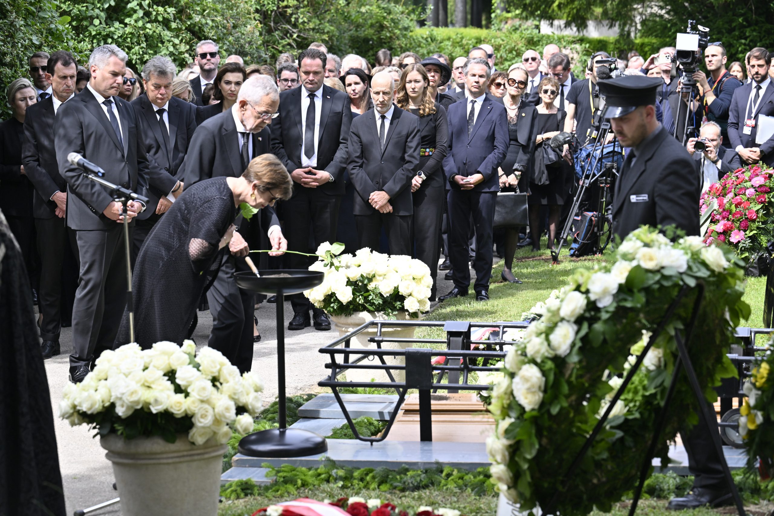 Mit Polizeieskorte wurde der Sarg anschließend zum Wiener Zentralfriedhof gebracht. Die dortige feierliche Beisetzung - ebenfalls in Anwesenheit der Staatsspitze - dauerte eine halbe Stunde. Die Zeremonie leitete ein Beistand der früheren Bundeskanzlerin, der Pfarrer von Ober St. Veit, Stefan Reuffurth. Ein zuvor befürchteter Andrang blieb aus.