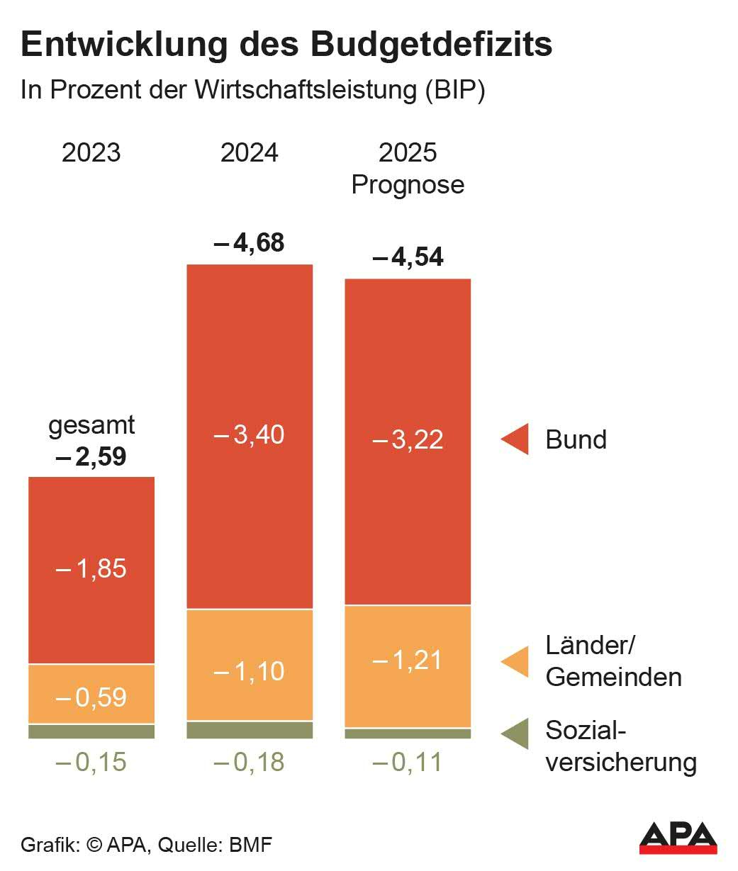 Finance Minister Markus Marterbauer (SPÖ) specifically expects a deficit of over 23 billion. This would correspond to 4.54 percent of GDP, instead of the originally forecasted 4.51 percent. The fact that the Maastricht balance has only minimally worsened despite the forecast deteriorating by a good billion is due to the nominal GDP also increasing accordingly.