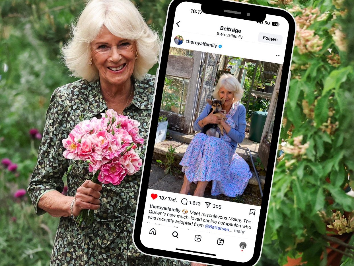 Königin Camilla hat eine neue tierische Begleiterin: Moley, ein junger Jack-Russell-Mischling, wurde aus dem Tierheim "Battersea Dogs and Cats Home" adoptiert – Camilla ist Schirmherrin der Einrichtung. Auf Instagram veröffentlichte der Buckingham-Palast nun das erste Foto der kleinen Hündin. Es zeigt die 77-Jährige auf einer Gartentreppe, im geblümten Kleid mit blauer Strickjacke, Moley entspannt auf ihrem Schoß. Der Beitrag wurde vielfach geteilt – Moley wird damit schnell zum neuen Star im Palast.