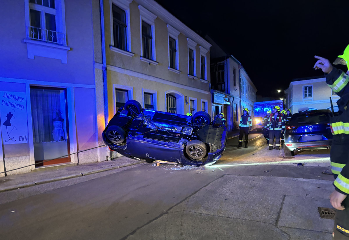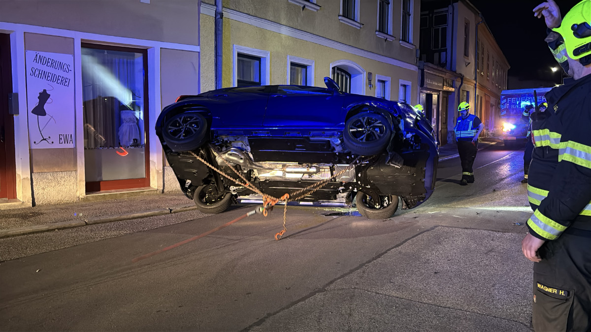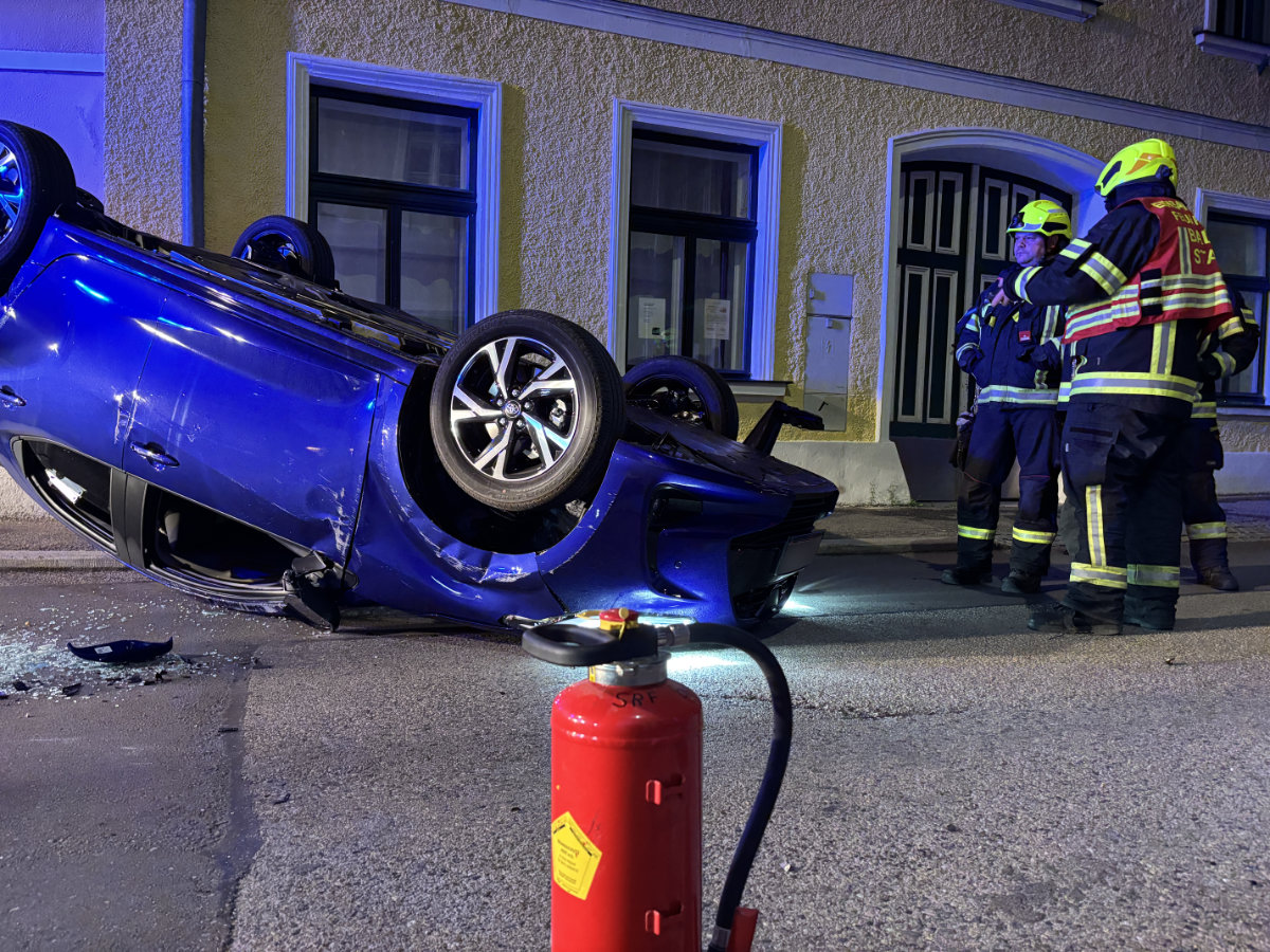 Upon the arrival of the emergency services, the crashed vehicle was lying on its roof. The slightly injured person had already freed themselves from the car and was being treated by the Red Cross.