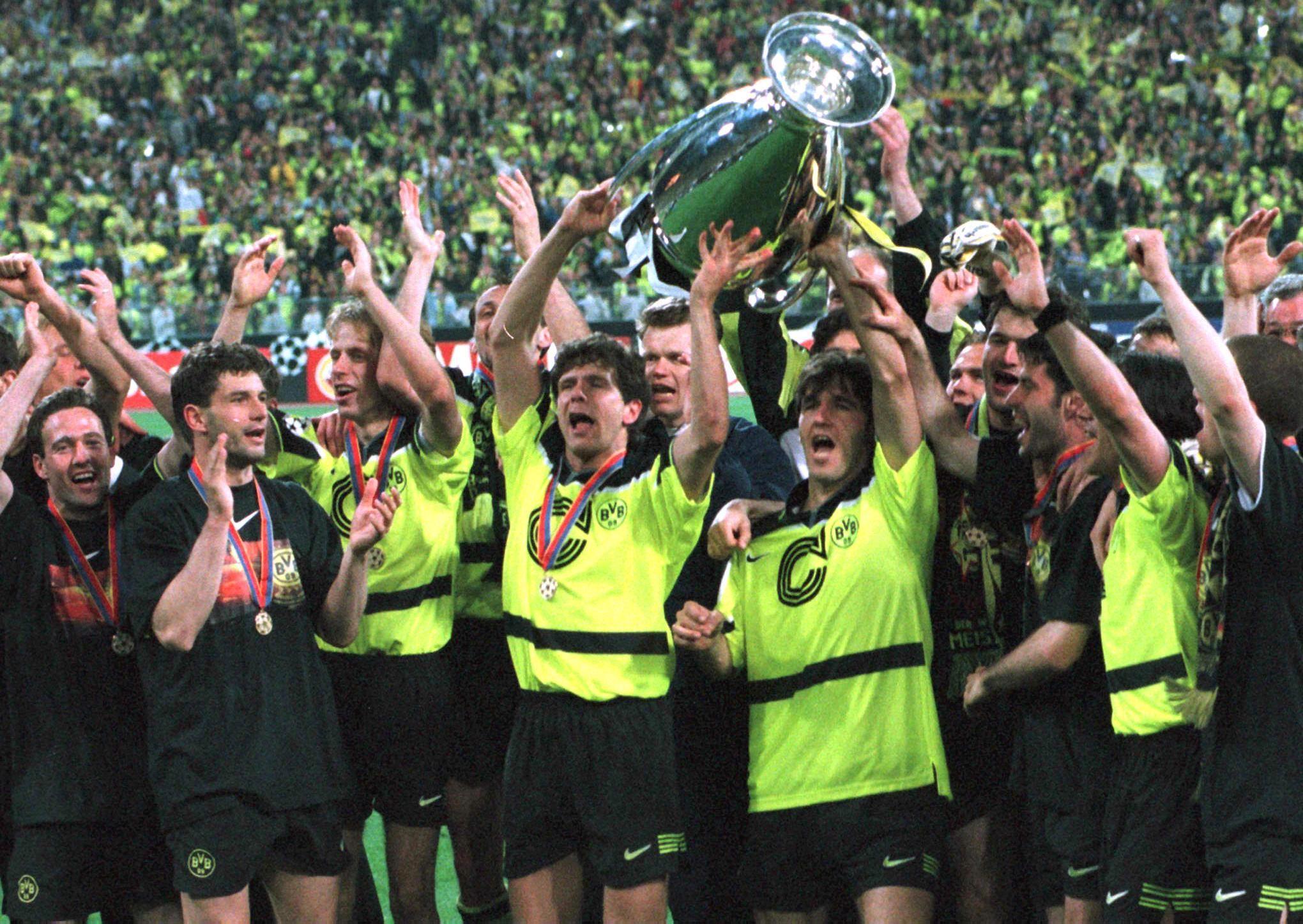 Die Dortmunder Mannschaft angeführt von Andreas Möller nach dem Champions League-Sieg gegen Juventus Turin im Jahr 1997. Damals war man übrigens auch der klare Außenseiter. ©DPA