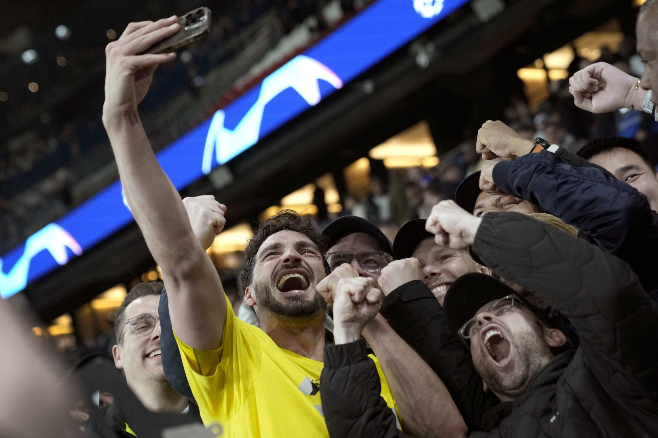 Vereinslegende Mats Hummels feiert den Finaleinzug mit den mitgereisten Fans im Parc des Princes. ©AP