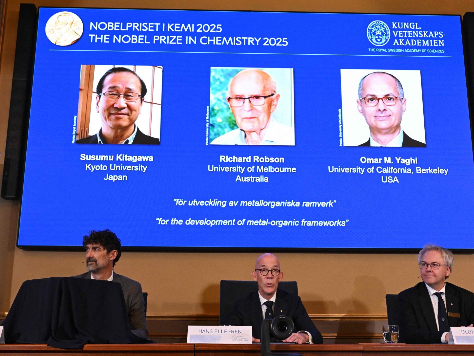 Der Chemie-Nobelpreis 2025 geht an den Japaner Susumu Kitagawa von der Kyoto University, den an der University Melbourne tätigen Briten Richard Robson und den gebürtigen Jordanier Omar M. Yaghi von der University of California in Berkeley. Sie werden für die "Entwicklung metallorganischer Gerüstverbindungen" geehrt, gab die Königlich-Schwedische Akademie der Wissenschaften am Mittwoch in Stockholm bekannt. Diese neue Molekülarchitektur zeichnet sich durch hohe Porosität aus.
