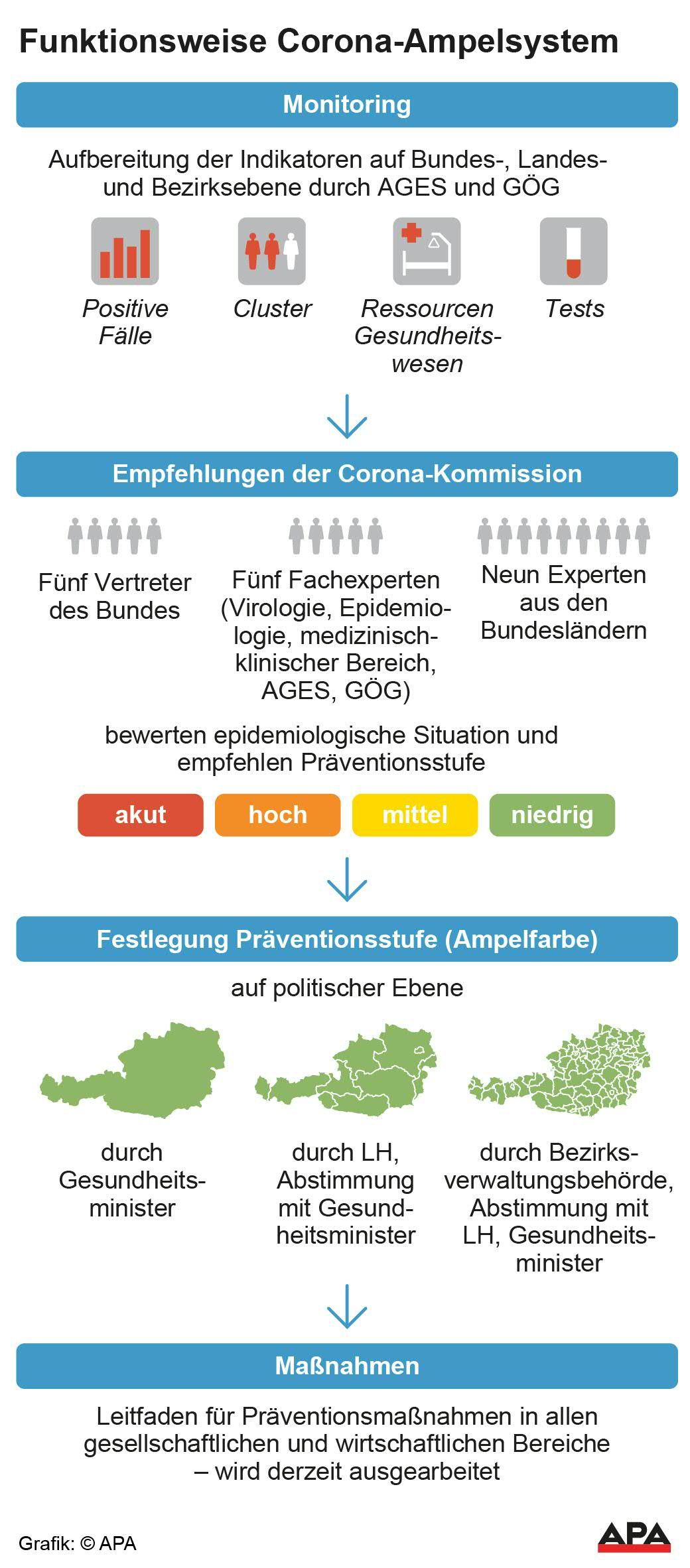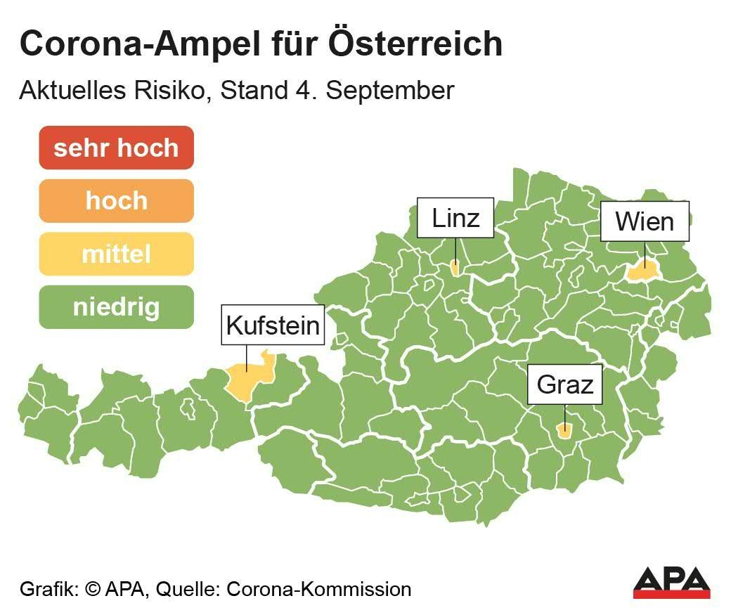 In Vorarlberg gibt es auch eine eigene Landes-Corona-Kommission, die sich am Montagmorgen darüber beraten hat, ob die Ampel für Vorarlberg auf Gelb geschaltet werden soll. Wie ORF Vorarlberg berichtet, seien die Experten im Land aber nach reiflicher Überlegung zu dem Entschluss gekommen, dass sie auf Grün bleiben kann, weil die Cluster in Vorarlberg relativ gut identifiziert werden können, der Spitalsbereich gut aufgestellt sei und die Testungen auf einem guten Niveau seien.