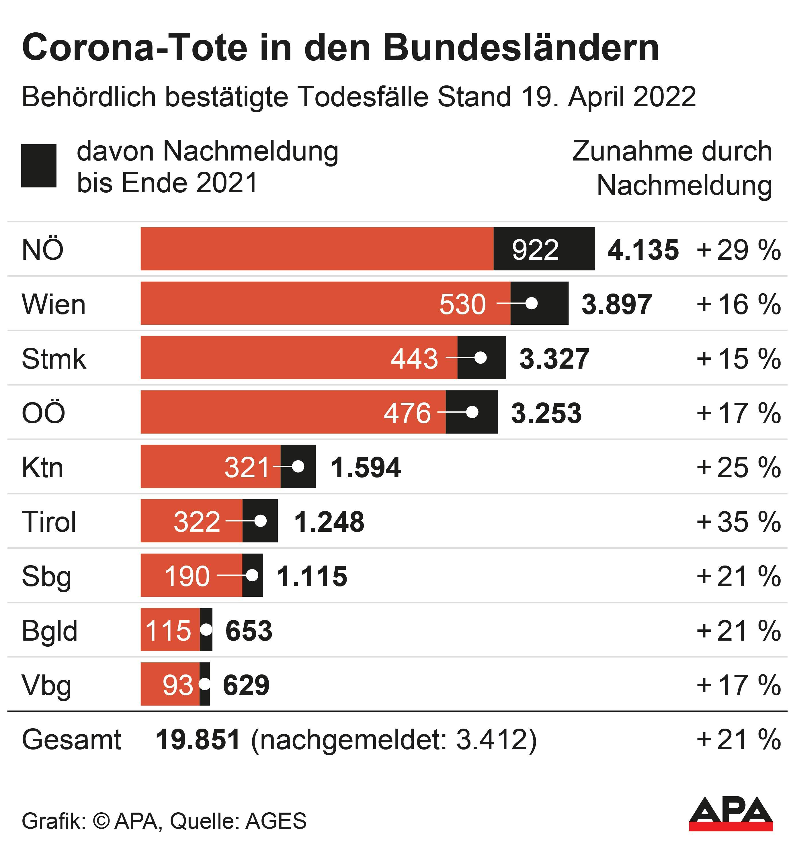 Im Burgenland (plus 115 auf 653) und in Salzburg (plus 190 auf 1.115) erhöht sich die Zahl der Corona-Toten durch die Nachmeldungen um ein Fünftel. In Oberösterreich (plus 476 auf 3.253) und Vorarlberg (plus 93 auf 629) machen die Nachmeldungen jeweils 17 Prozent aus. Am wenigsten Nachmeldungen gibt mit 17 Prozent in der Steiermark (plus 443 auf 3.327) und Vorarlberg (plus 93 auf 629) sowie mit 16 Prozent in Wien (plus 530 auf 3.897).