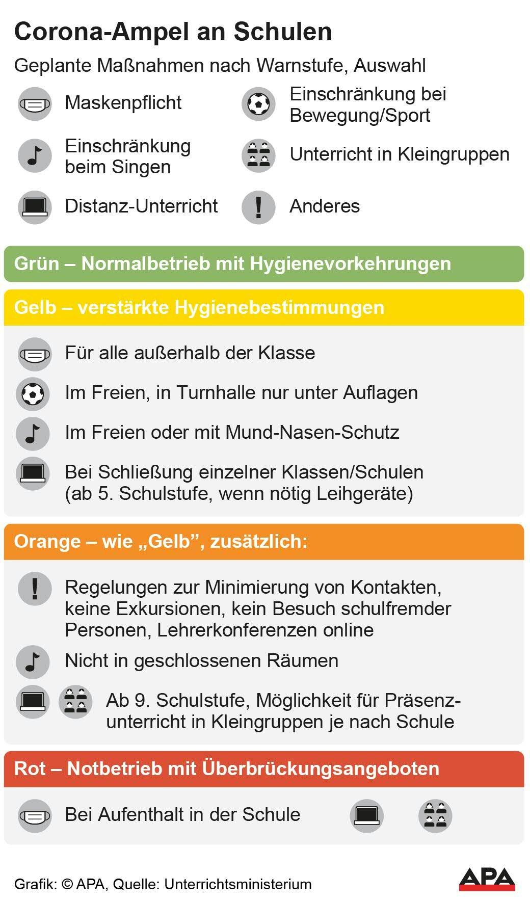 Die erste Schaltung der Corona-Ampel wird heute Freitag erfolgen. Auf einer Webseite wird über die Lage bis hinab auf Bezirksebene informiert. Unbekannt waren zunächst die Konsequenzen, die sich aus den vier Farben von Grün (niedriges Risiko) bis Rot (sehr hohes Risiko) ableiten. Durchgesickert war am Donnerstag, dass der Bezirk Kufstein sowie die Städte Wien, Linz und Graz gelb geschaltet werden.