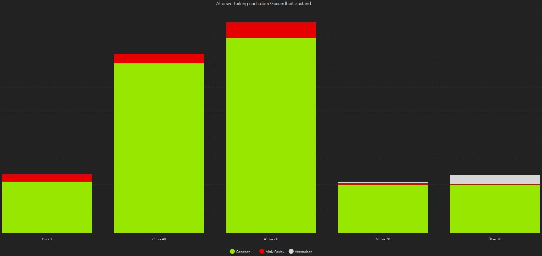 Ein Blick auf die Altersverteilung der Infizierten zeigt, dass es in Vorarlberg derzeit die meisten aktiven Fälle in der Gruppe der 40- bis 60-Jährigen gibt. Hingegen gibt es in der besonders gefährdeten Gruppe der über 70-Jährigen derzeit nur einen Corona-Infizierten.