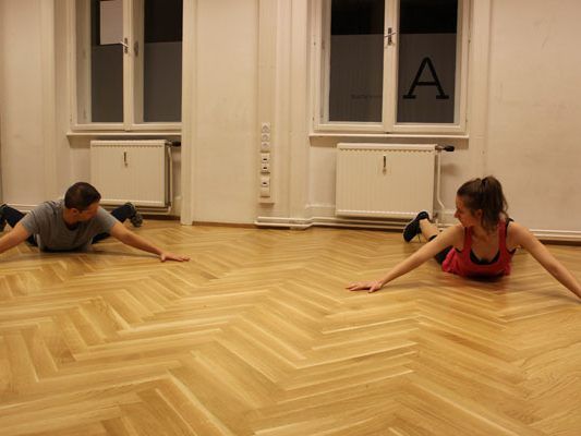 Los geht das Training noch mit gemütlichen Aufwärm- und Dehnübungen, die Elemente aus Yoga beeinhalten. Insgesamt sei Crawling ein Mix aus verschiedenen Disziplinen, erklärt Trainer Hargitay. Er selbst ist Tänzer, unterrichtet Contemporary Dance und gründete die interdisziplinäre Bewegungsform Bodyparkour. Für seinen Crawling-Kurs, den er dieses Semester zum ersten Mal im Lyma-Studio in Wien-Mariahilf anbietet, übernahm er Elemente aus Tanz und Parkour.
