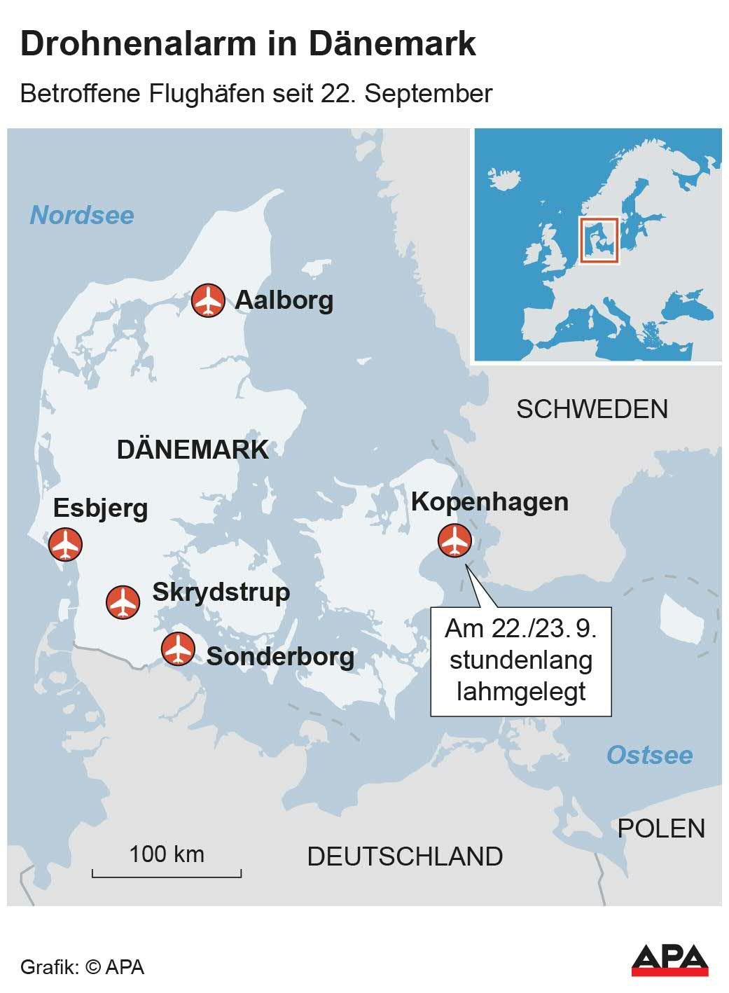 In der Nacht auf Freitag war es neuerlich zu einem Drohnenalarm im aktuellen EU-Ratsvorsitzland gekommen, wobei der Verkehr am Flughafen Aalborg beeinträchtigt wurde. Der Flug KL1289 sei nach Amsterdam zurückgekehrt und der Flug SK1225 aus Kopenhagen sei gestrichen worden, meldete der Flugverfolgungsdienst FlightRadar24 am Freitag. Der Luftraum über dem Flughafen sei am späten Donnerstagabend um 23.40 Uhr Ortszeit geschlossen und am Freitag um 00.35 Uhr wieder geöffnet worden, meldete die Nachrichtenagentur Ritzau. Die Polizei habe die Sichtung einer Drohne noch nicht bestätigt. Der Luftraum über dem Flughafen Aalborg war bereits in der Nacht auf Donnerstag wegen der Sichtung von Drohnen geschlossen worden.