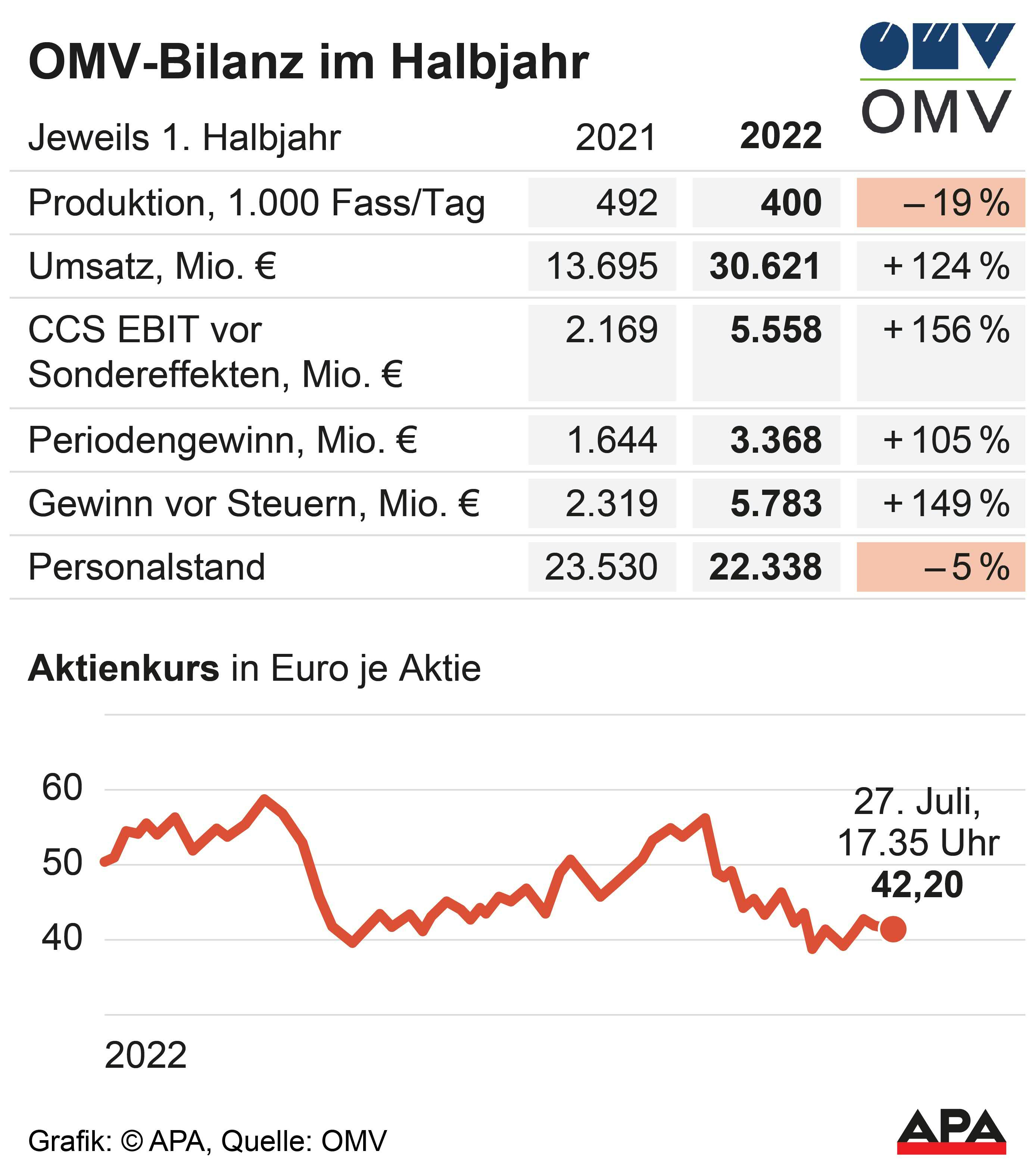 Der Umsatz der OMV stieg um 124 Prozent auf 30,6 Mrd. Euro, das CCS Operative Ergebnis vor Sondereffekten von 2,169 Mrd. auf 5,558 Mrd. Euro. Der den Aktionären zuzurechnende Periodenüberschuss wurde um 95 Prozent auf 2,493 Mrd. Euro gesteigert, wie das Unternehmen am Donnerstag in der Früh mitteilte.