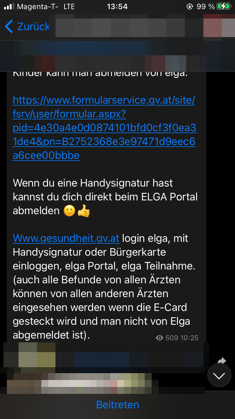In einschlägigen Telegram-Gruppen wird aktuell dazu aufgerufen, sich von der ELGA abzumelden, um dem Staat keinen Einblick auf den Impfstatus zu gewähren. Die Abmeldung vom e-Impfpass ist allerdings gar nicht möglich.