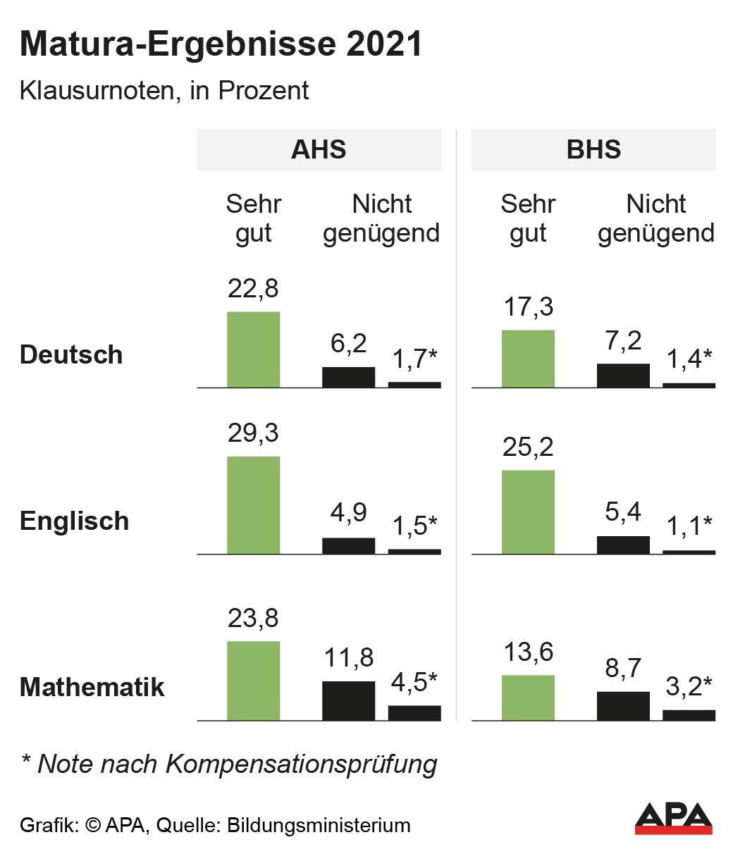 Im Vorjahr schlossen an den AHS und BHS nur jeweils 0,4 Prozent der Schüler die Matura negativ ab. Heuer waren es dagegen 1,7 (AHS) bzw. 1,4 Prozent (BHS): In Englisch schafften es nach 0,7 (AHS) bzw. 0,6 Prozent (BHS) im Vorjahr heuer 1,5 (AHS) bzw. 1,1 Prozent (BHS) nicht. Und in der Mathematik gab es heuer an den AHS für 4,5 Prozent der Schüler Fünfer (2020: 2,5 Prozent) und an den BHS für 3,2 Prozent (2020: 1,3 Prozent).
