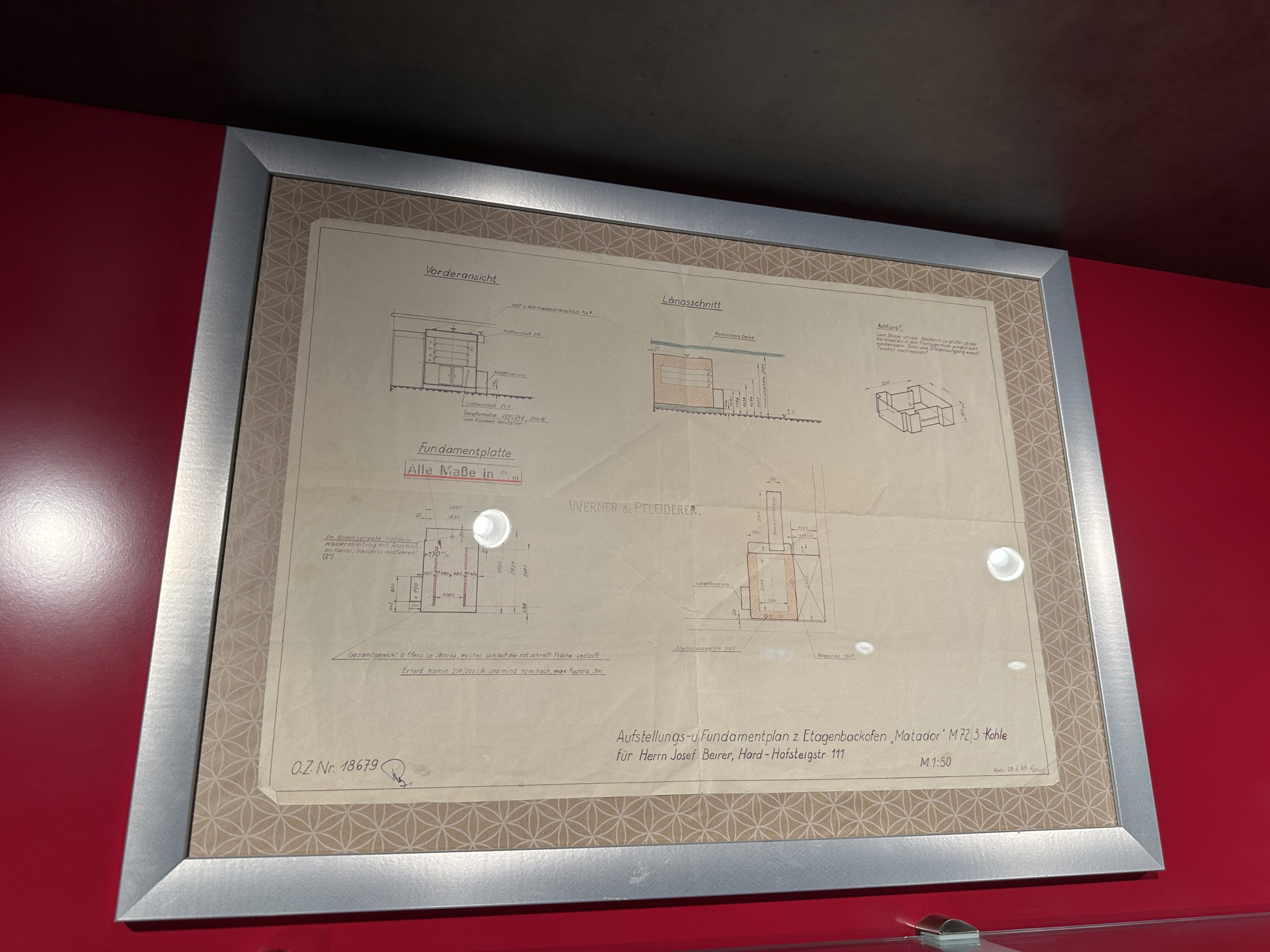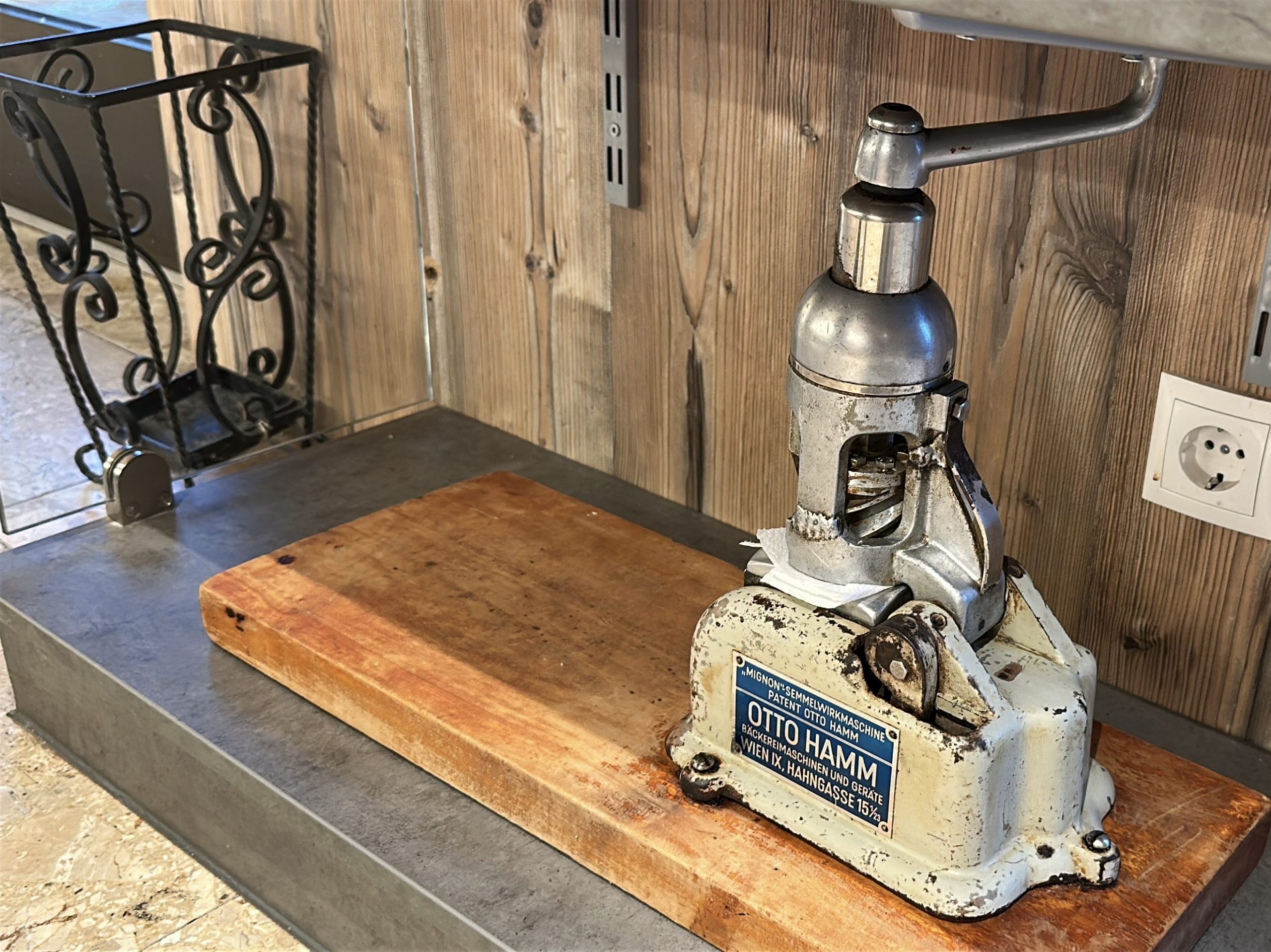 Auch die erste und letzte Wickelmaschine aus den 70ern, mit der Gipfel und Stängel hergestellt wurden, steht an einem Ehrenplatz im Verkaufsraum. Auf dem Tresen sieht man zudem die allererste Waage, die im Laden stand. Auch Planungszeichnungen des ersten Ofens in der Backstube sieht man neben Fotos der alten Bäckerei gerahmt an der Wand.