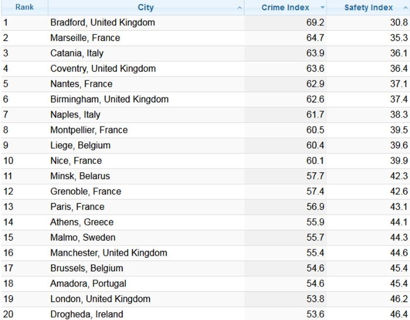 Laut dem Ranking soll die gefährlichste Stadt Europas die englische Stadt Bradford sein. Darauf folgen Marseille (Frankreich), Catania (Italien) und Coventry (UK). Außerdem unter den Top 10: Nantes (Frankreich), Birmingham (UK), Neapel (Italien), Montpellier (Frankreich), Lüttich (Belgien) und Nizza (Frankreich).