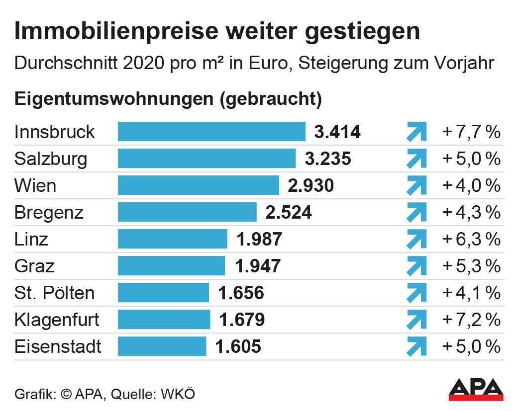 In Wien verteuerten sich Eigentumswohnungen im Erstbezug um 4,7 Prozent auf durchschnittlich 4.237,09 Euro, gebrauchte Wohnungen um 4,4 Prozent auf 2.930,20 Euro, Reihenhäuser um 2,3 Prozent auf 2.476,14 Euro und Einfamilienhäuser um 4,2 Prozent auf 2.775,64 Euro je Quadratmeter. Als "dämpfende Faktoren" führte Pisecky an, dass in Wien bei Neuerrichtungen von der Widmung her zwei Drittel gefördert gebaut werden müssen, und weiters "die Preisdynamik bei den Baukosten", also die anziehenden Baupreise. Weiters werde "die Leistbarkeit der Wohnungen sicher mal ein Thema werden".