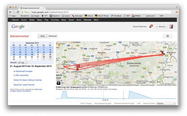 Es muss einiges los gewesen sein bei mir im Mai. Neben den üblicherweise täglichen Fahrten von meinem Wohnort an meine Arbeitsstätte (“Google Maps” markiert die beiden Orte praktischerweise neuerdings mit Häuschen-, bzw. Aktenkoffer-Symbolen) sind auch Reisen nach Zürich, Wien und in die USA – sowie ein Bootsausflug auf dem Bodensee vermerkt. Fein säuberlich. Auf die Sekunde genau. Zugestimmt habe ich wohl, würde Googles Rechtsabteilung feststellen. Bei der Installation der Apps wird ja gefragt, ob Google meine Position verwenden darf. Wer Google Maps oder Google Now verwenden will, muss zustimmen. Das hab’ ich auch gemacht.