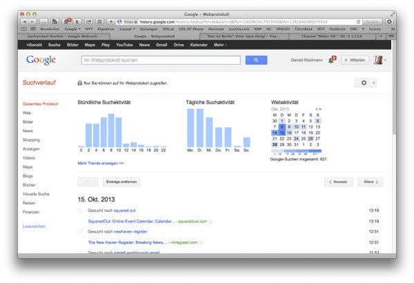 Zudem legt Google jeden Suchbegriff, den wir eintippen, ins Archiv. Im Google Suchverlauf wird ausgewertet, an welchen Wochentagen wir üblicherweise suchen, welche Bilder wir gesucht haben – und sogar, auf welche Google-Anzeigen wir geklickt haben. Damit wird die Geschichte eines Lebens transparent, eine Biographie in Echtzeit, die sich mit jedem Suchbegriff fortschreibt.