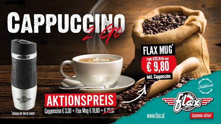 Den gesamten September über sparst du dir 13,30€ und zahlst nur 9,80€ statt 23,10€ für den Flax Mug inklusive Cappuccino!