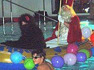 Danach schickte der Hl. Nikolaus seine Nixe BIANCA Neusser voraus, die als Einstimmung zur Nikolausfeier zu Weihnachtsmusik mit bezaubernden Tanz- und Tauchvorführungen begeistern konnte. Dann erfolgte der große Auftritt vom Nikolaus! Vom Organisationschef Peter Kat wurde er drei kräftigen Schwimmern anvertraut, die ihn im Schlauchboot durch das Mehrzweckbecken des Stadtbades zogen.