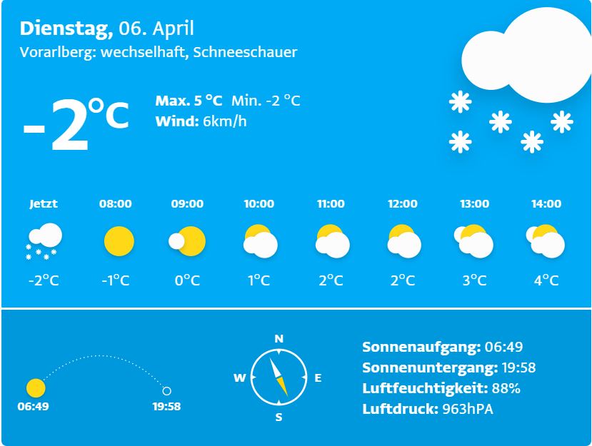 Der Tag beginnt klar und verbreitet frostig. Vormittags gehen sich ein paar sonnige Stunden aus, nachmittags peitschen wieder ein paar schwache Schnee- und Graupelschauer durch, gefolgt von Auflockerungen - typisches Aprilwetter, allerdings viel zu kalt. Die Tiefstwerte liegen bei -6 bis -2 Grad, die Höchstwerte bei 1 bis 5 Grad.