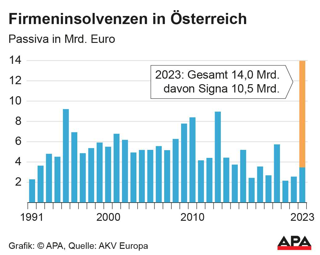 Besonders hervorzuheben ist der signifikante Anstieg der Gesamtverbindlichkeiten, der vor allem auf Insolvenzen im Signa-Konzern zurückzuführen ist. Der AKV berichtet von einem "nie da gewesenen explosionsartigen Anstieg der Gesamtverbindlichkeiten", der von 2,3 Mrd. Euro im Jahr 2022 auf 3,5 Mrd. Euro im Jahr 2023 gestiegen ist, selbst ohne die Berücksichtigung der Signa-Fälle. Von den gesamten 14 Mrd. Euro an Verbindlichkeiten entfielen fast 10,5 Mrd. Euro auf die sieben Insolvenzen innerhalb des Signa-Konzerns. Die Signa Holding meldete Ende November 2023 Insolvenz an, gefolgt von den Tochtergesellschaften Prime und Development im darauffolgenden Monat.