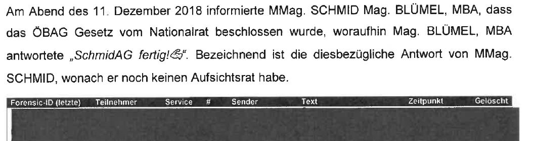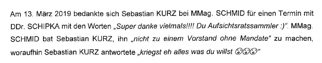 Angesichts der nun ausgewerteten Chatverläufe sieht die WKStA darin mögliche Falschaussagen. Die Ermittler gehen nämlich davon aus, dass sich Kurz und Schmid spätestens ab Mitte 2017 regelmäßig über die Entwicklung des Projekts unterhielten. Dafür spricht aus Sicht der Ermittler auch, dass Schmid den Kanzler selbst über kritische Medienanfragen zum ÖBIB-Projekt informierte und ihn um Intervention bat. Die Unterhaltungen gipfelten schließlich in Schmids Bitte "mach mich nicht zu einem Vorstand ohne Mandate" und Kurz' Antwort: "kriegst eh alles was du willst."