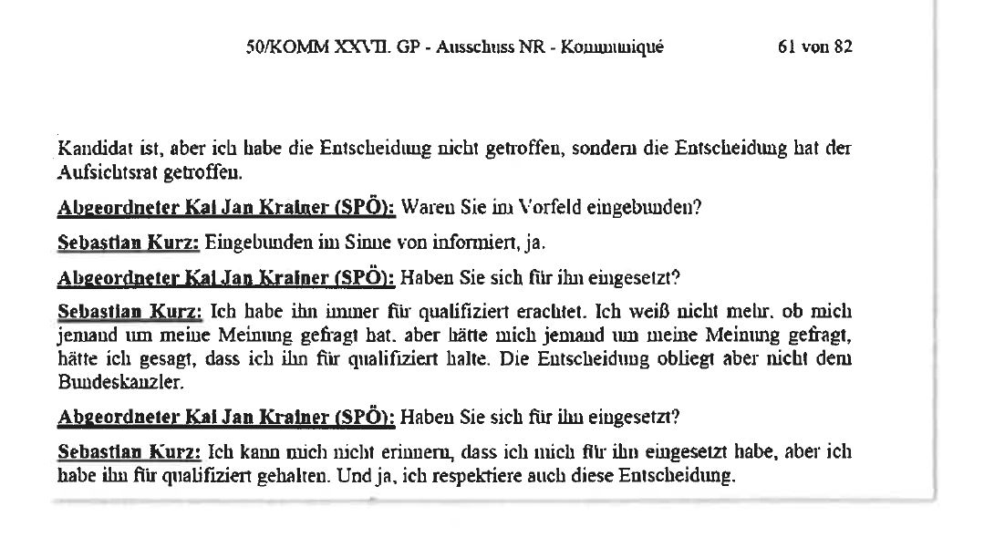Mehrere Abgeordnete hatten ihn im Ausschuss nach seiner Involvierung in die Vorgänge befragt und ausweichende oder abschlägige Antworten erhalten. So sagte Kurz auf die Frage des SP-Abgeordneten Jan Krainer, ob er im Vorfeld eingebunden war: "Eingebunden im Sinne von informiert, ja." Über die Aufsichtsratsbesetzungen sei er nur "manchmal mehr, manchmal weniger" informiert worden. Und gänzlich verneint hat Kurz die Frage von NEOS-Mandatar Helmut Brandstätter, ob er mit Schmid schon darüber gesprochen habe, bevor ihm dieser nach der Ausschreibung seine Bewerbungsabsicht eröffnete. "Nein, es war allgemein bekannt, dass ihn das grundsätzlich interessiert, und es war sicherlich auch so, dass immer wieder davon gesprochen wurde, dass er ein potenziell qualifizierter Kandidat wäre."