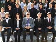1. Reihe v. l. n. r.: Stefan Kopf, KV Prof. Mag. Alexandra Bader, Dir. HR Mag. Helmut Braun, Lukas Frankenberger, Luca Clavadetscher;