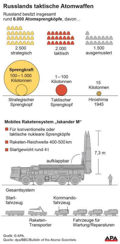 Neue Sorgen schürte dabei zuletzt die völkerrechtswidrige Annexion von vier besetzten ukrainischen Gebieten. Unter anderem Putin kündigte danach an, man werde sie mit allen zur Verfügung stehenden Mitteln verteidigen. Damit heizte der Kremlchef Spekulationen an, Russland könne auf dem Schlachtfeld taktische Atomwaffen mit eingeschränkter Reichweite einsetzen.