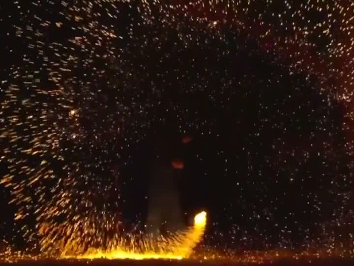 Die Versuchsanordnung sieht vor, dass sehr feine Stahlwolle entzündet und dann, an einem Drahtseil befestigt, herumgeschleudert wird. Die Highspeed-Filmaufnahmen sind extrem faszinierend.