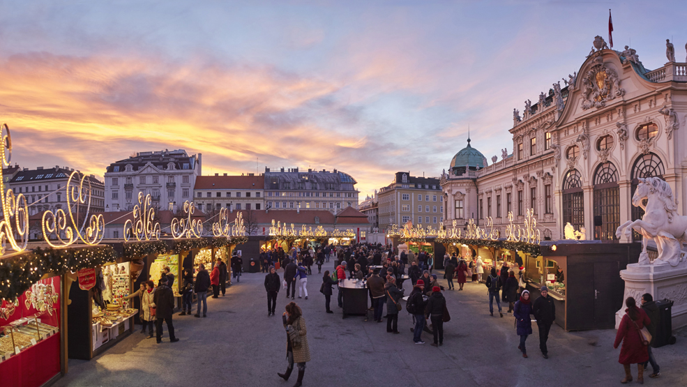 Das Weihnachtsdorf Schloss Belvedere erstrahlt ab 17. November wieder in stilvollem barocken Design. Über 40 Aussteller locken in den romantischen Schlosspark des Oberen Belvedere. Auch bei diesem Adventmarkt kann unter anderem durch Kunsthandwerksstücke und Weihnachtgeschenke gestöbert werden. Bei den gastronomischen Ständen sind vor allem die typisch österreichischen Punsch- und Glühweinvariationen zu empfehlen.